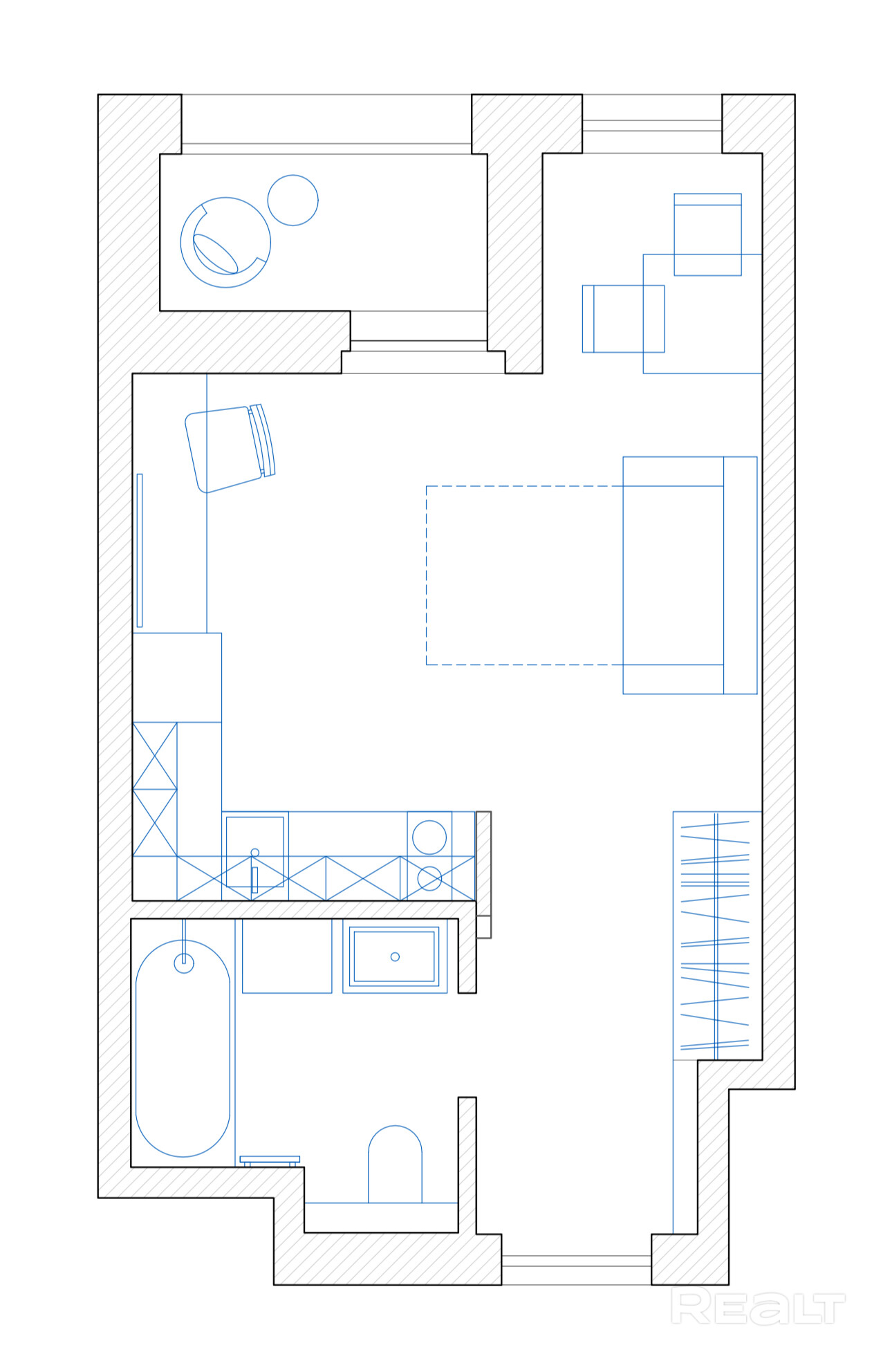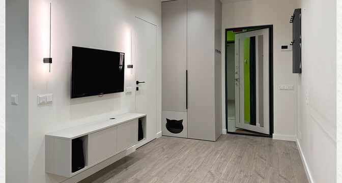 В студии сделан современный ремонт. Тут получилось частично зонировать кухню. В прихожей стоят шкафы-купе. В комнате есть ниша, куда поставили кровать. На полу лежат паркетная доска и плитка. В квартире остаются встроенная мебель и техника: варочная панель, духовой шкаф, микроволновая печь. Остальное — по договоренности.