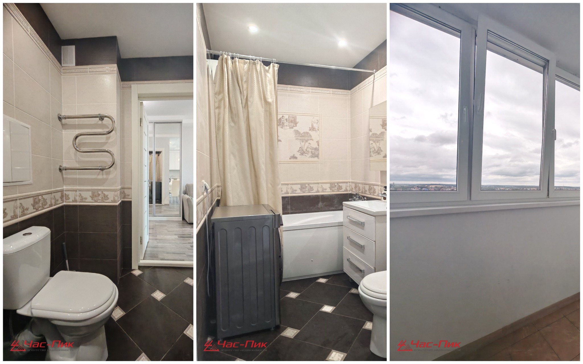 Квартира готова к проживанию. Тут светлый интерьер, лежит ламинат на полу в жилой части студии, а в совмещенном санузле — плитка. В стоимость входит кухонный гарнитур со встроенной бытовой техникой. Также имеется застекленная лоджия. В санузле установлен душ, помещается и стиральная машина.