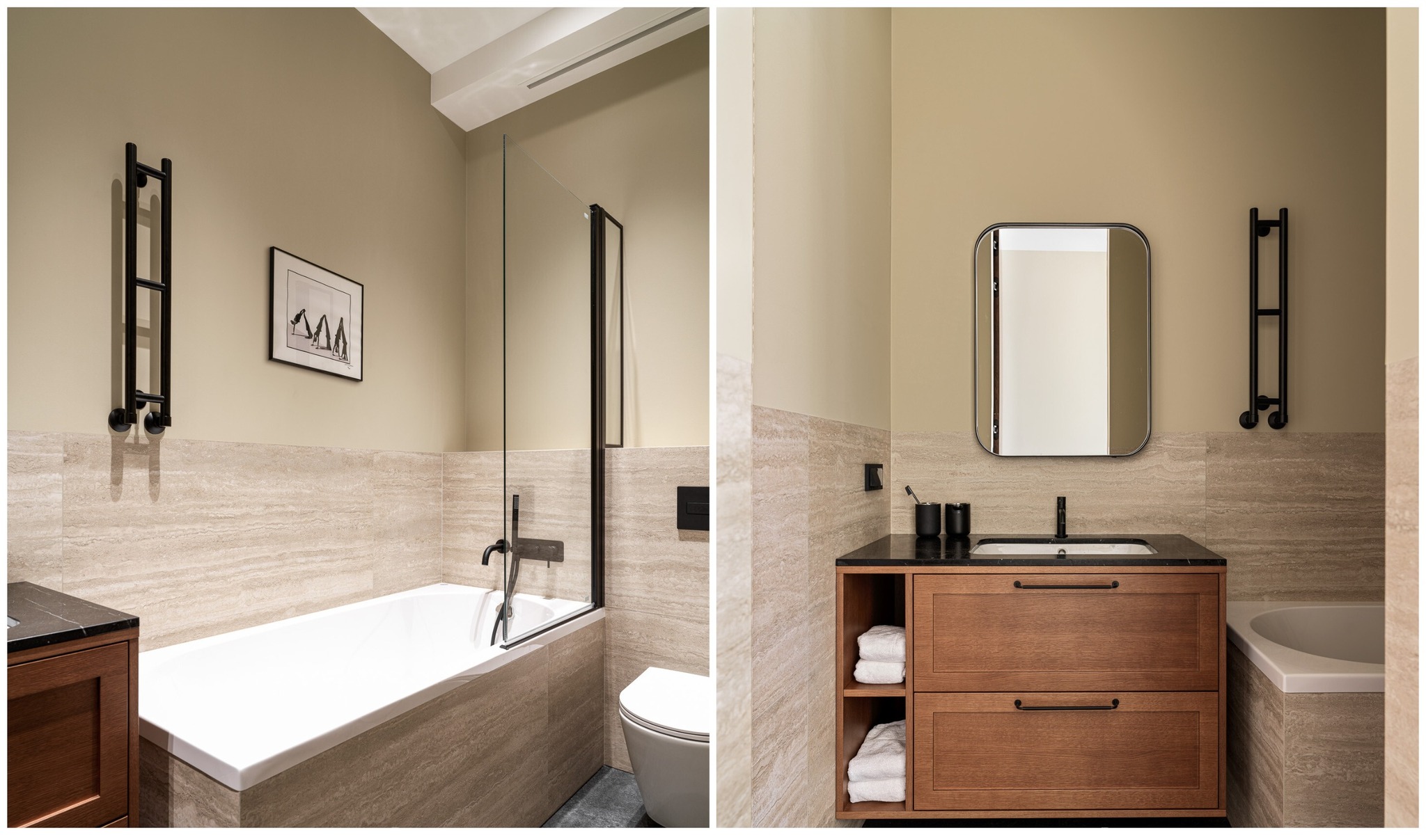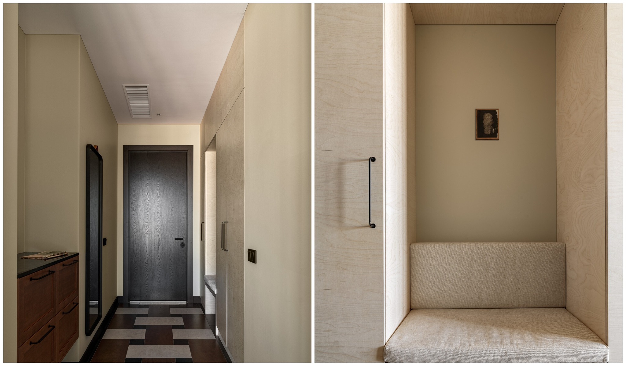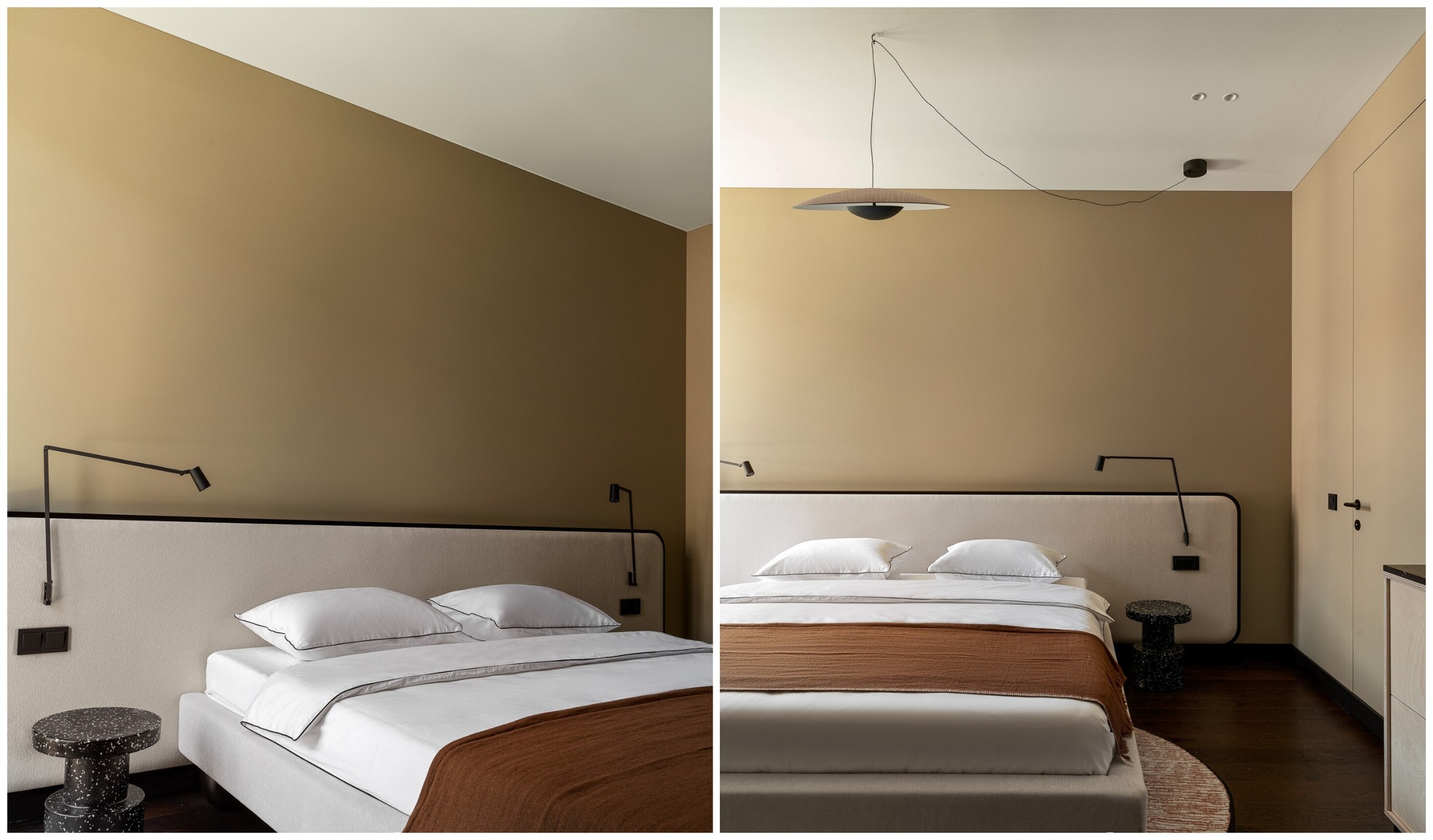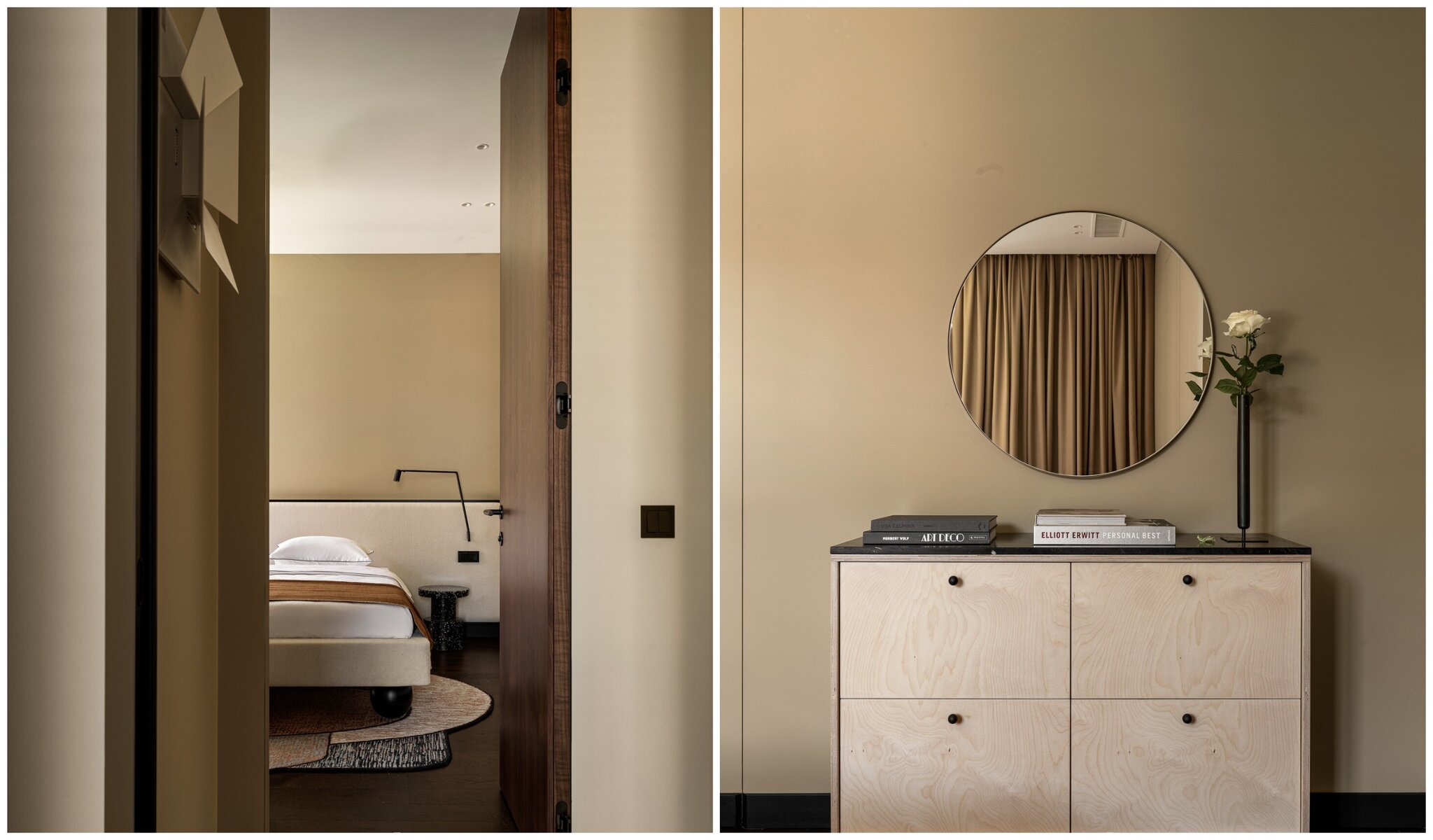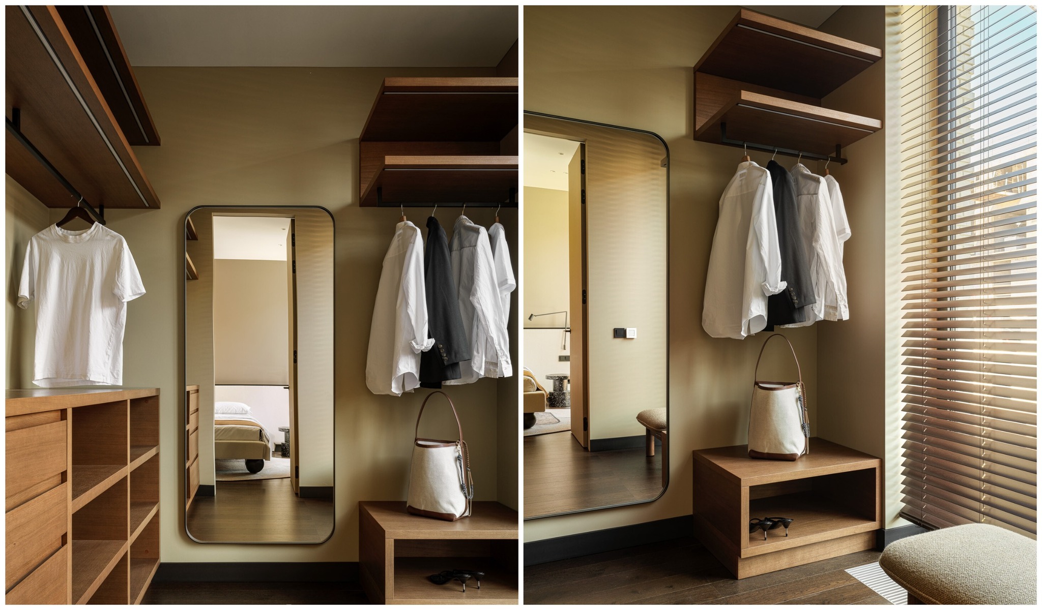 В квартире обустроена мастер-спальня, где есть выход в собственную гардеробную и личный совмещенный санузел.