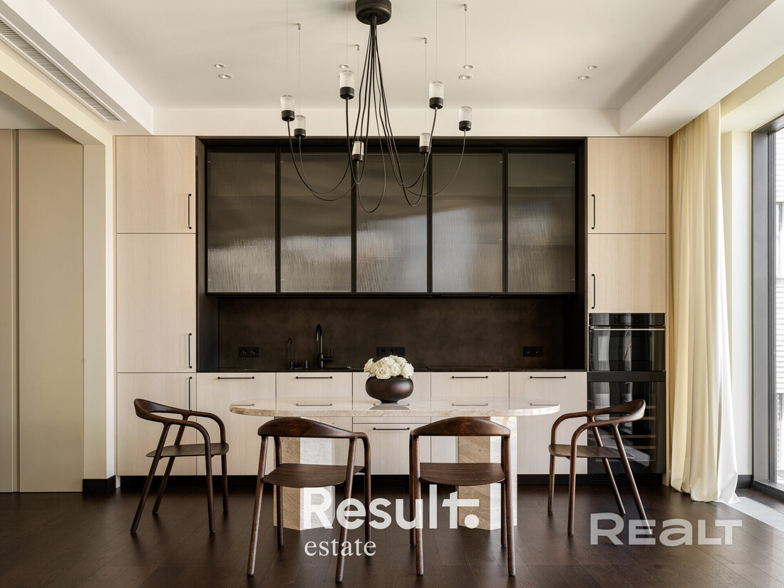 Кухня имеет и нижний, и верхний гарнитур со встроенной бытовой техникой. Напротив разместился обеденный стол. Одна стена состоит из больших окон, которые впускают в помещение много естественного света.