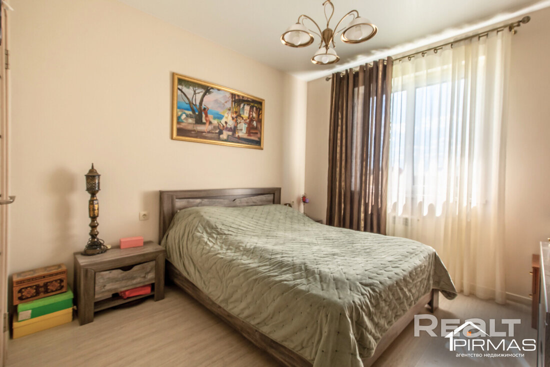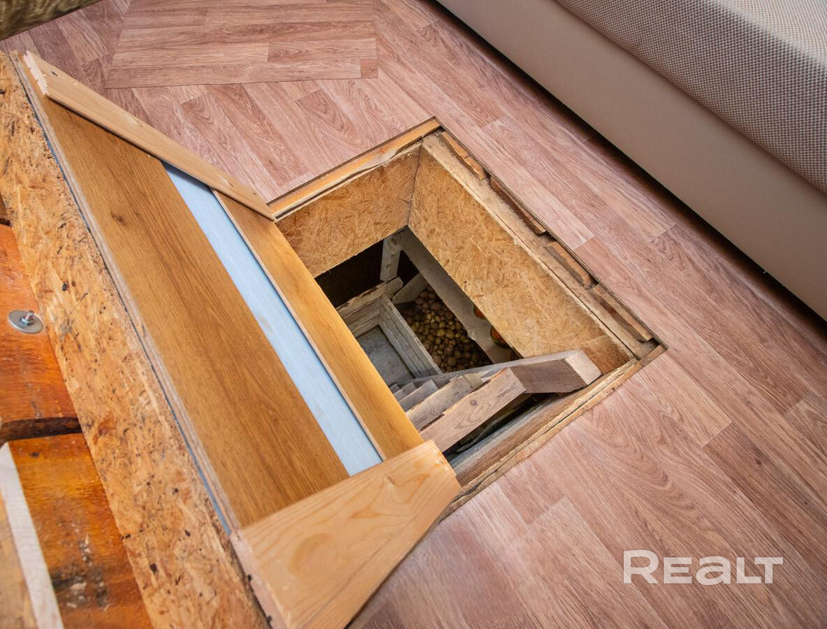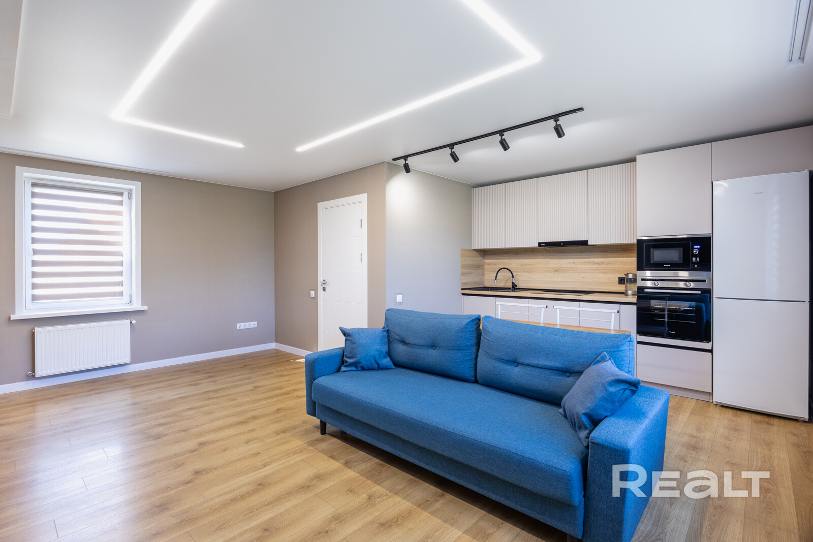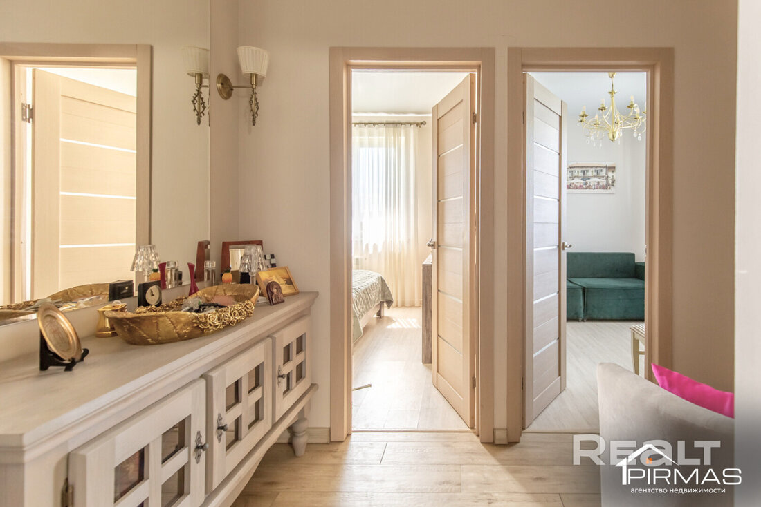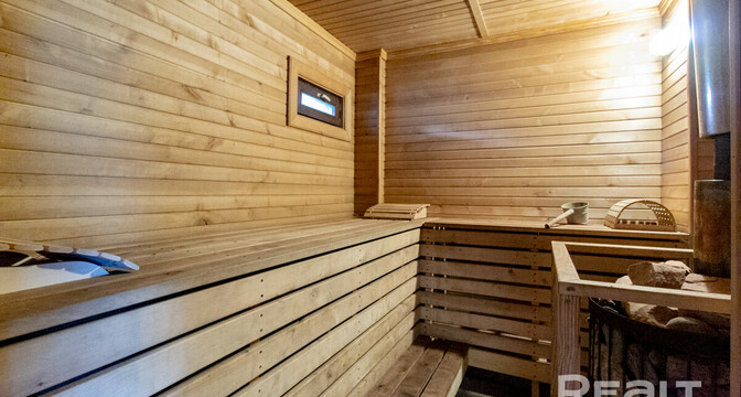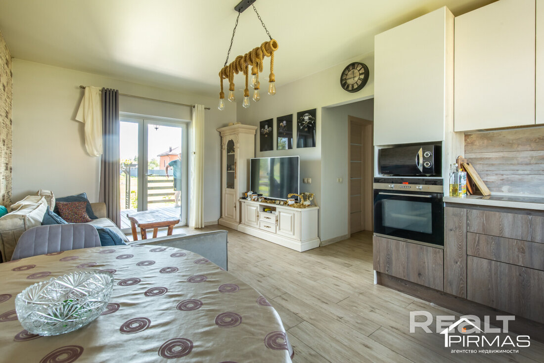 Общая площадь – 69,5 м2. Планировка такая: гостиная с кухонной зоной, две спальни с гардеробной, коридор, санузел, топочная. На полах ламинат и плитка с подогревом. На террасе имеется мини-кухня с горячей/холодной водой и канализацией, мебель ручной работы.
