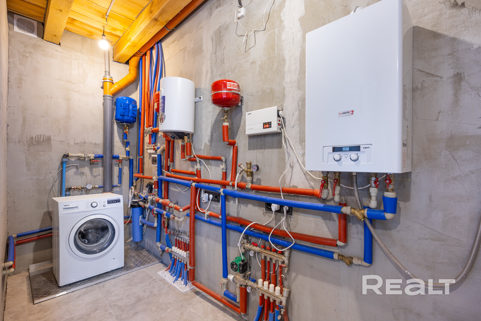 Отопление на газу, дополнительно уставлен электрический бойлер подогрева воды. Полы с подогревом, в спальных комнатах радиаторы. Электричество 380 В. Вода из скважины, канализация – станция биоочистки. Подведено оптоволокно.