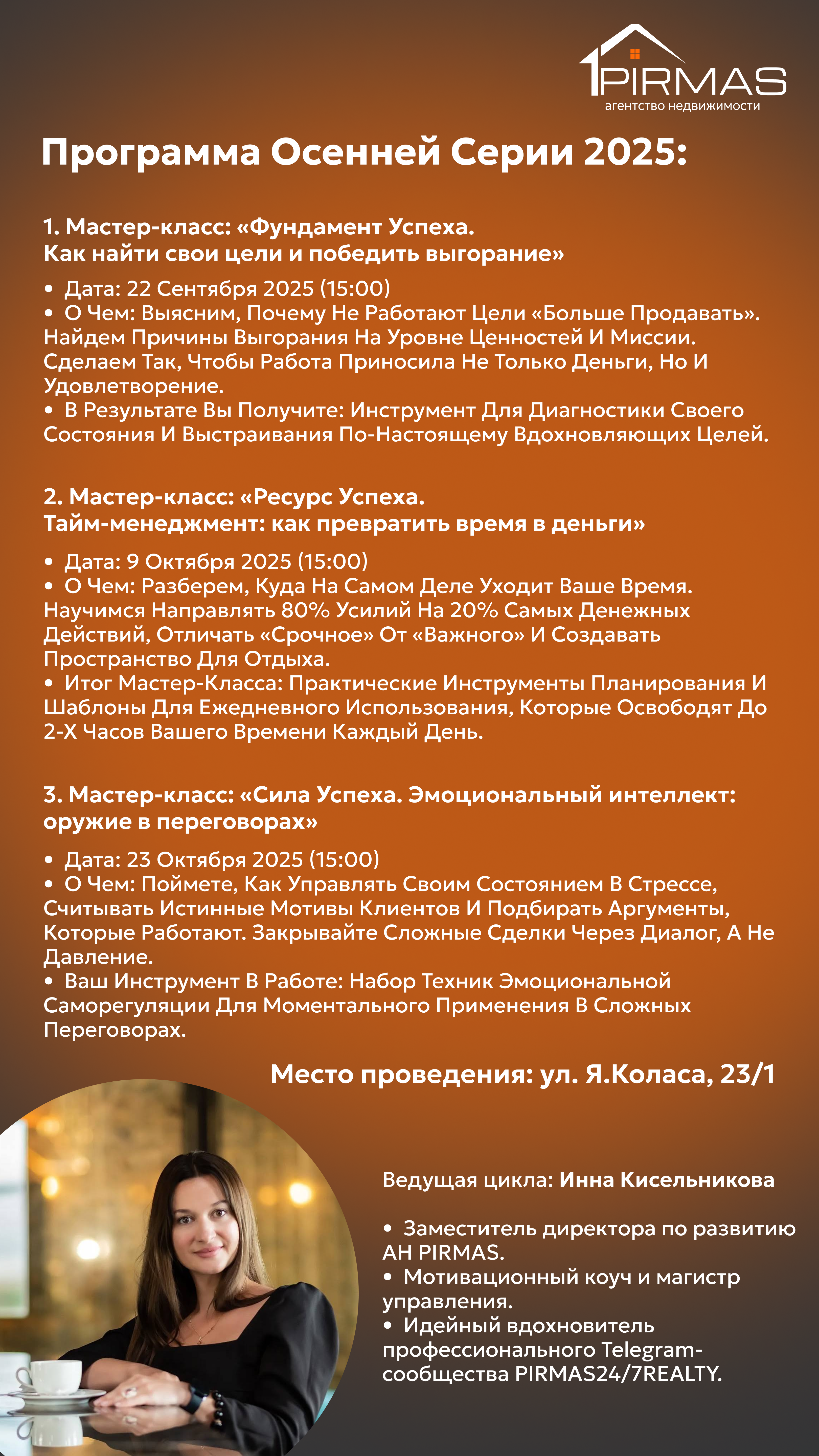 Устали от бесконечной гонки за сделками, где выгорание становится нормой, а доход — непредсказуемым? Знакомо ощущение «потолка», когда работаешь много, а результат не растет? Стоп. Это решаемо. Агентство недвижимости PIRMAS запускает закрытую осеннюю серию мастер-классов для риэлтеров и агентов Минска, которые готовы менять подход, а не просто искать разовые советы. Мы даем систему, чтобы работать осознанно и эффективно.