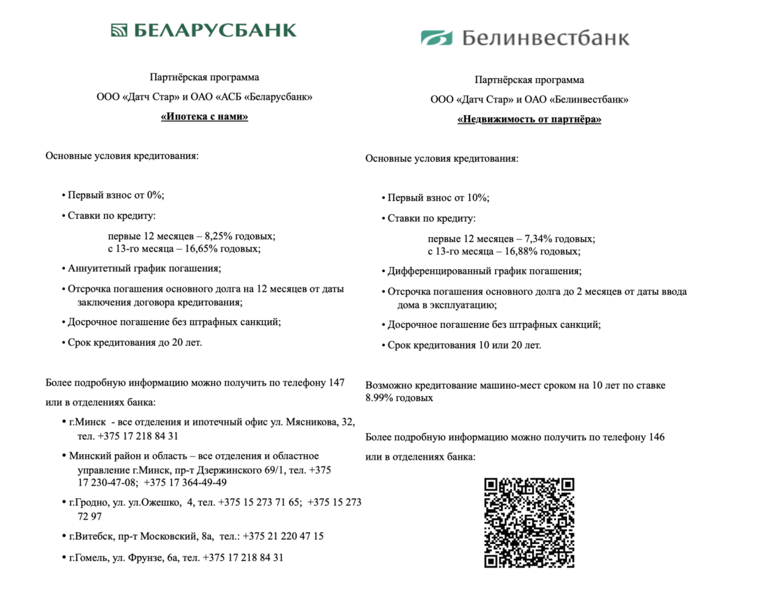 Если говорить подробнее о каждой партнерской программе, то ОАО «Белинвестбанк» предлагает кредитование на 10 и 20 лет с возможностью досрочного погашения без штрафных станций. Первый взнос — от 10 процентов.