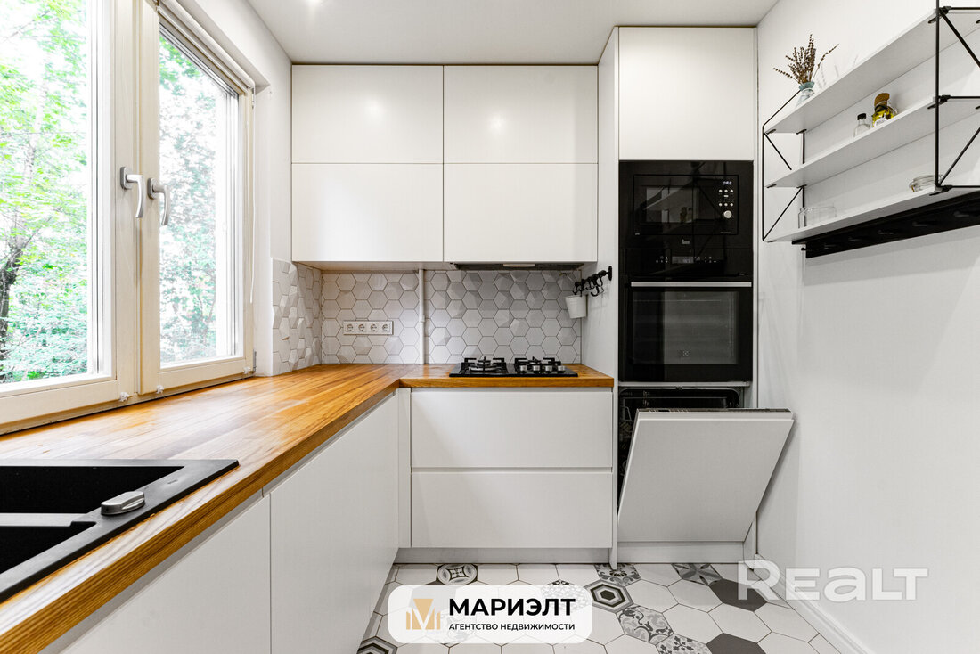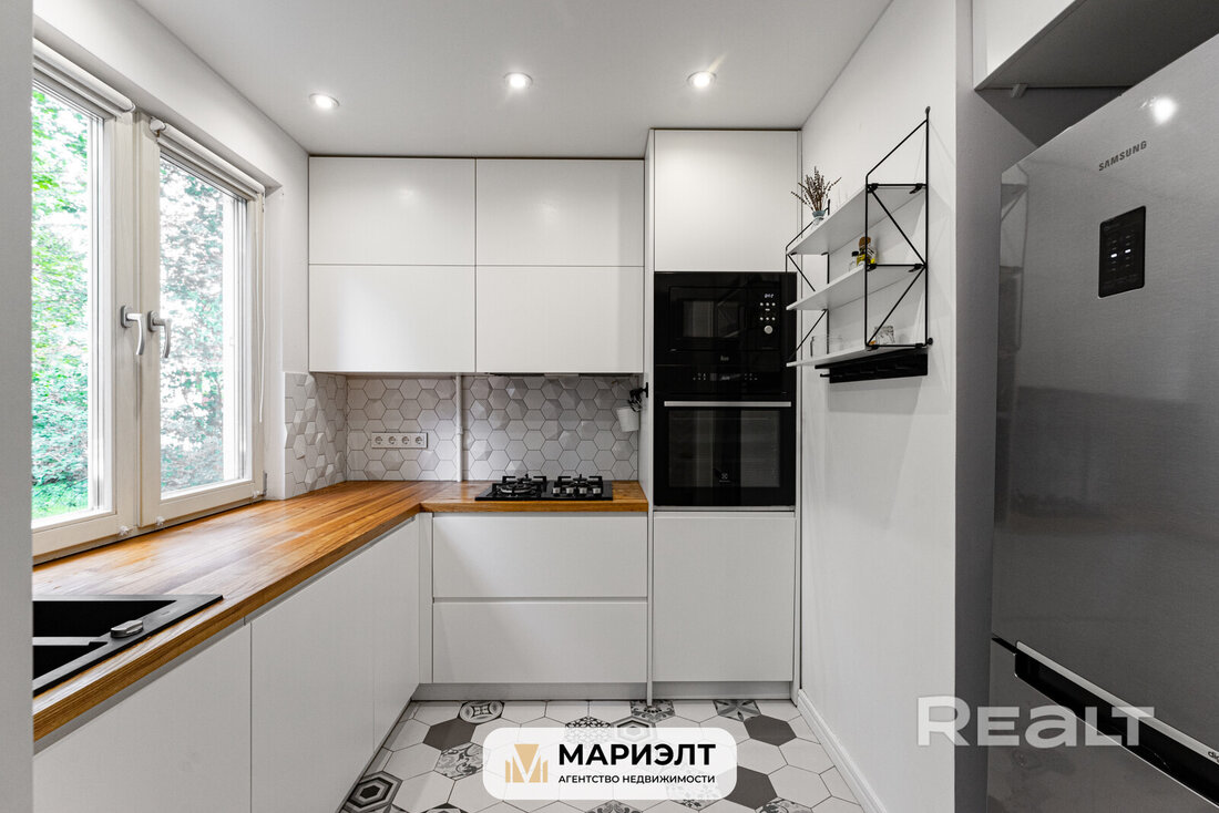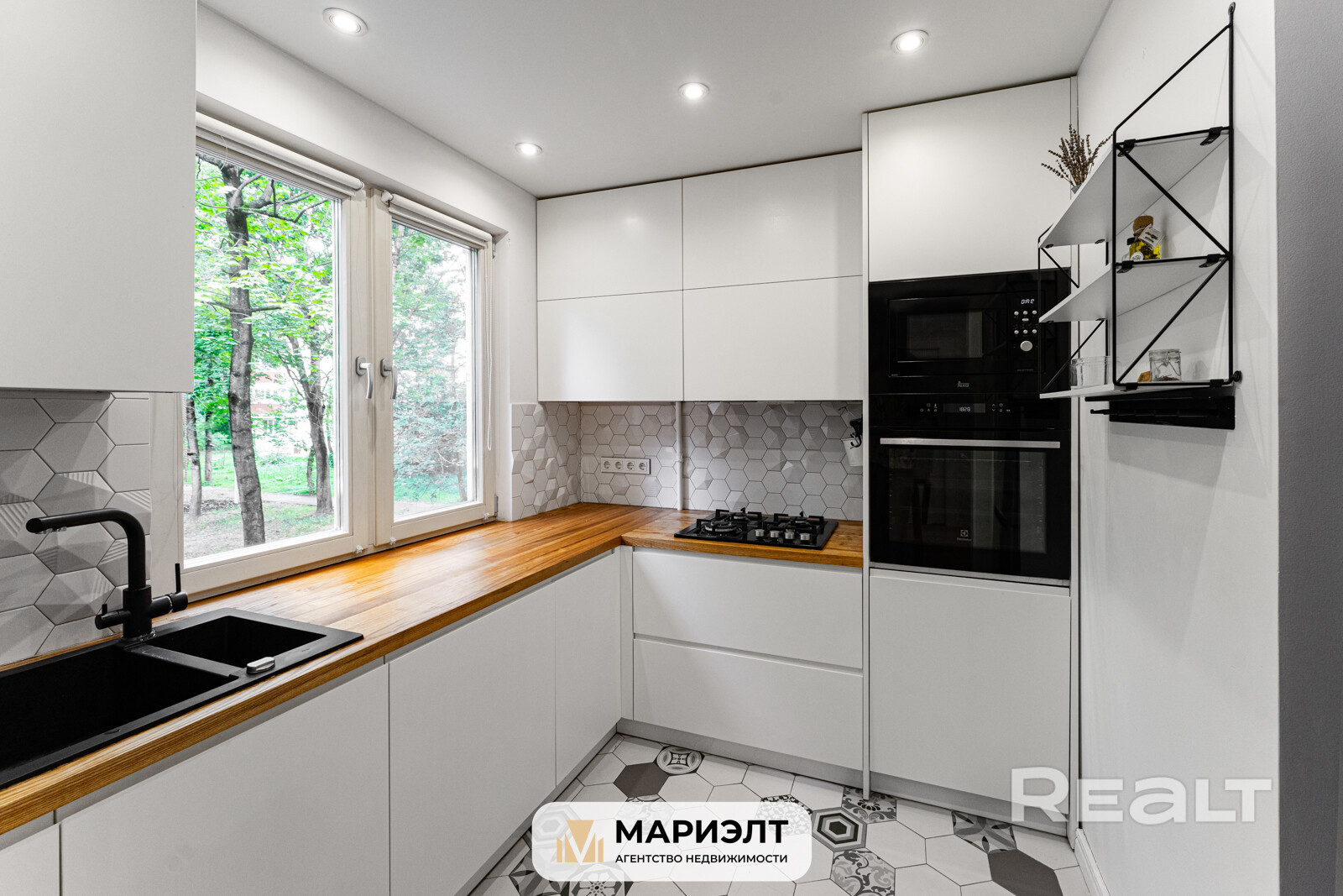 На улице Кедышко, в семи минутах ходьбы от станции метро «Парк Челюскинцев» на продажу выставили евротрешку с аккуратным ремонтом. Находится она в пятиэтажной хрущевке в хорошем зеленом районе. Посмотрим эту квартиру подробнее.