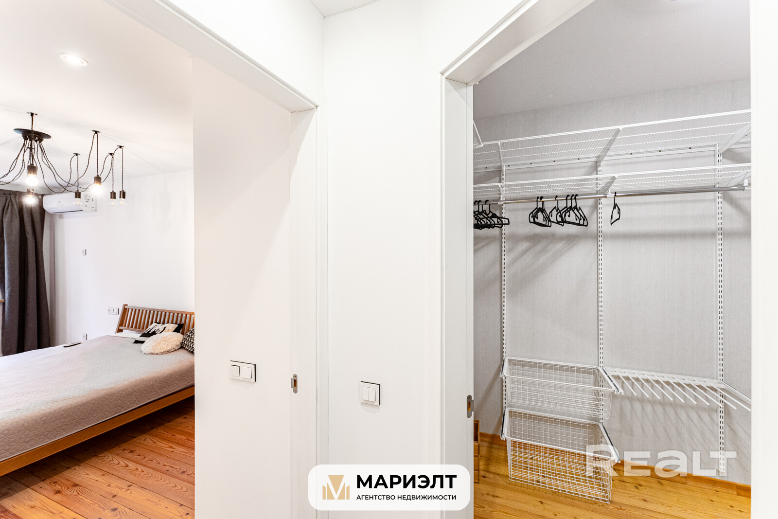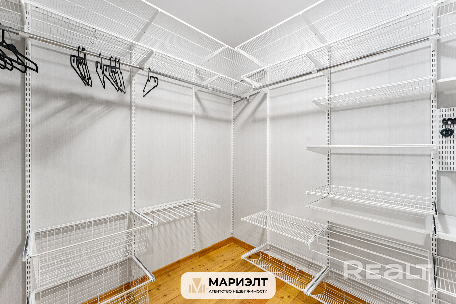 Около спальни оборудована гардеробная с трансформируемой шведской системой Elfa — она позволяет сделать индивидуальную комбинацию полок.
