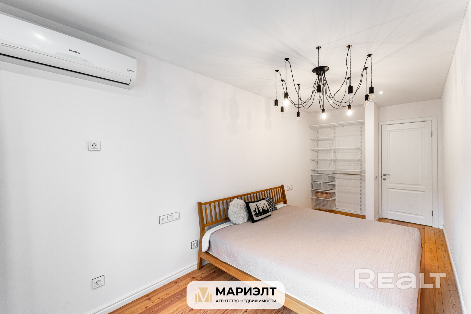 В спальне стоит новая кровать. Продавец говорит, что ее делали под заказ из массива дуба по проекту финского дизайнера. Из этого же материала выполнена и тумба. Установлен кондиционер.