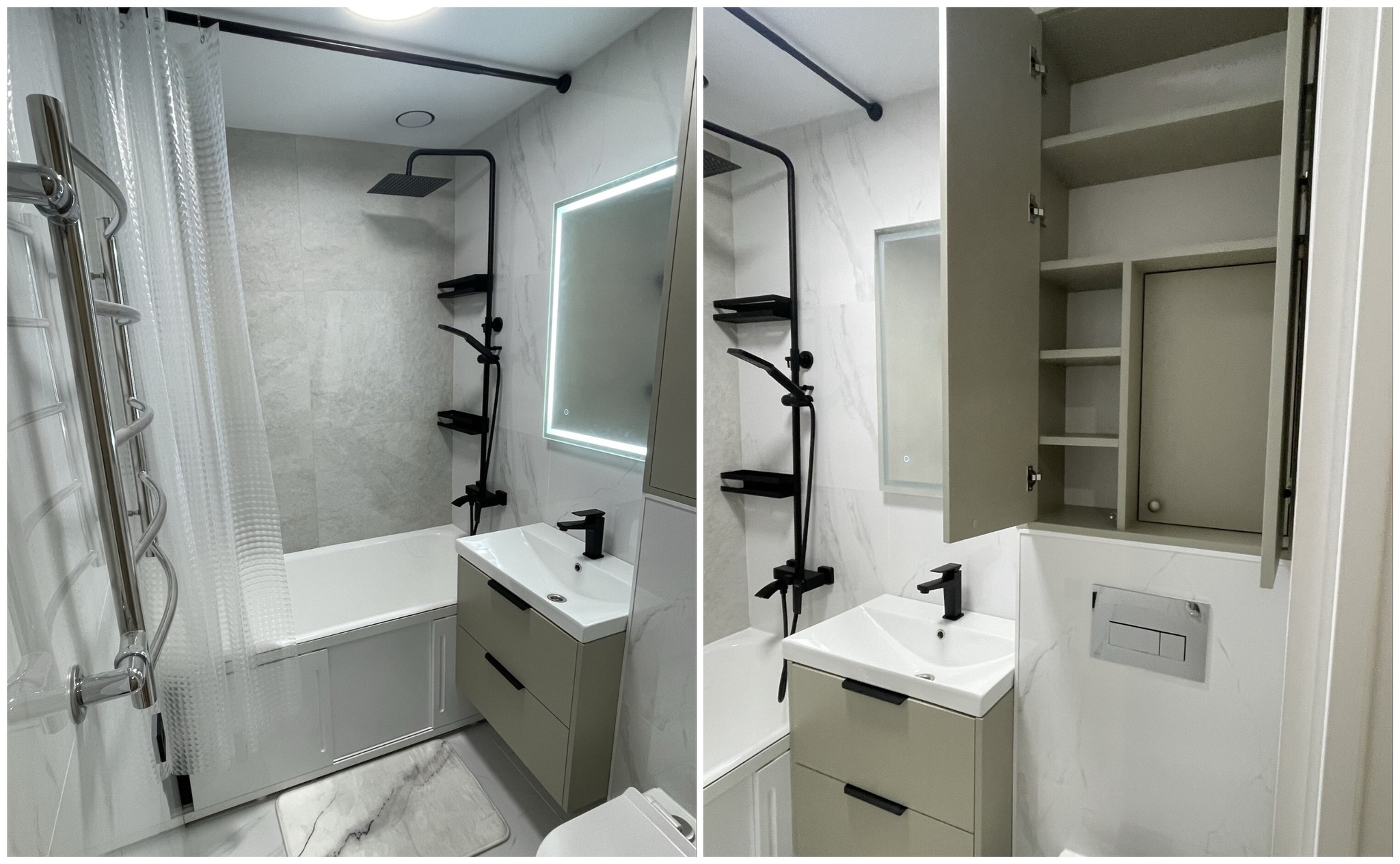 В совмещенном санузле лежит керамогранит, имеется инсталляция.
