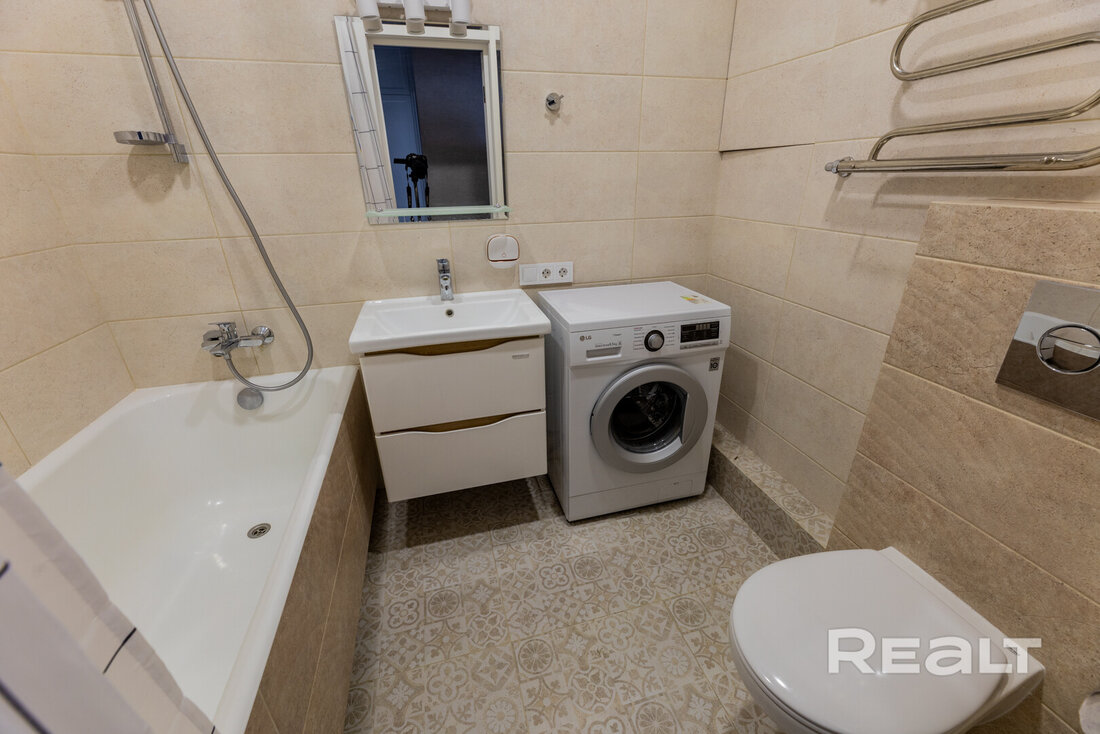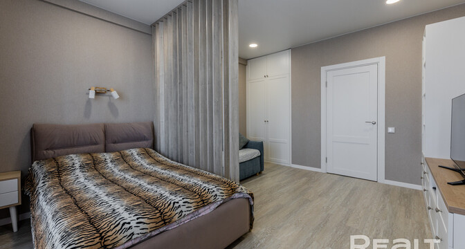 В просторной квартире удалось сделать перегородку, которая частично разделила комнату на гостиную и полноценную спальню. На полу лежит ламинат с пробковой подложкой. Жилье выставляется с мебелью и техникой, в том числе и той, что установлена в кухне: варочной панелью, духовым шкафом Electrolux, вытяжкой и холодильником. В однушке имеется отдельная гардеробная, где стоит стиральная машина.