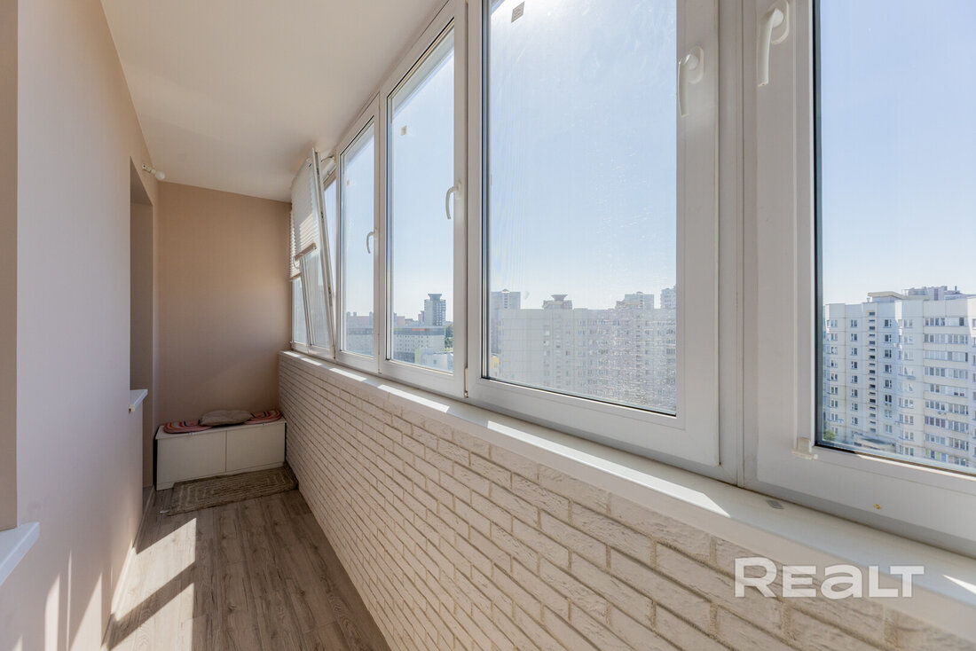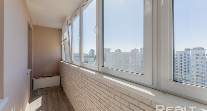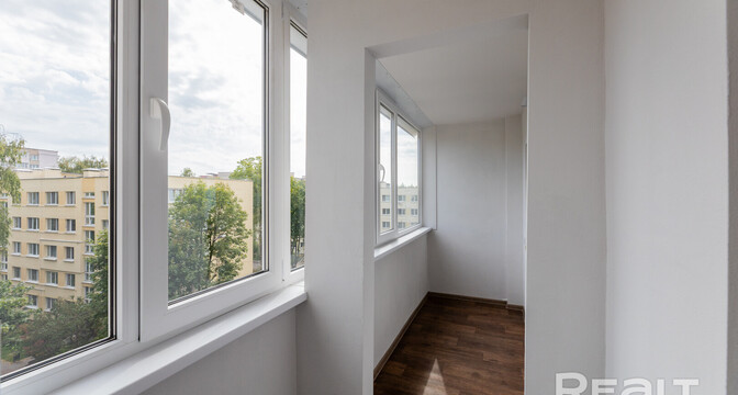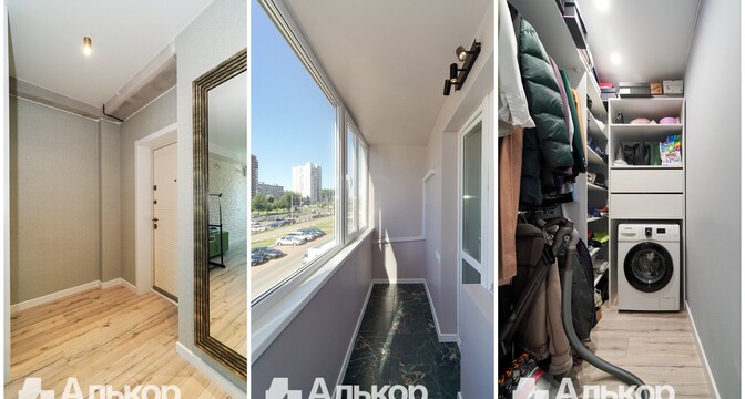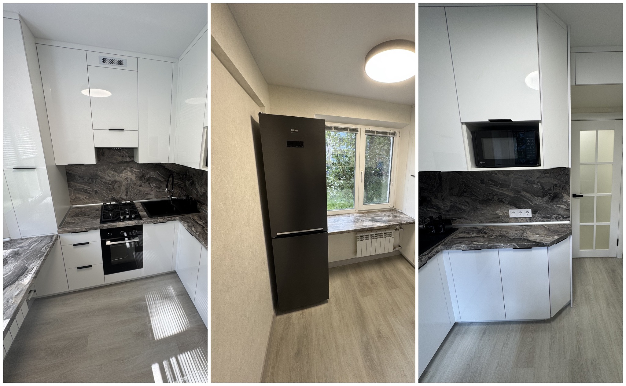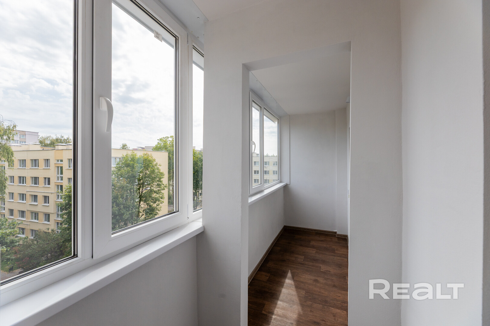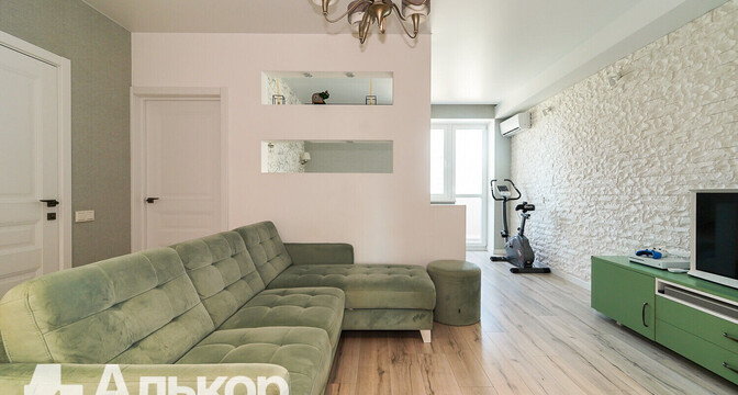 Здесь сделан современный ремонт. Кухня оснащена новой мебелью и техникой. Лишь жилую комнату нужно будет обставить мебелью. Стены тут покрашены. В этой квартире также имеется большой застекленный балкон.