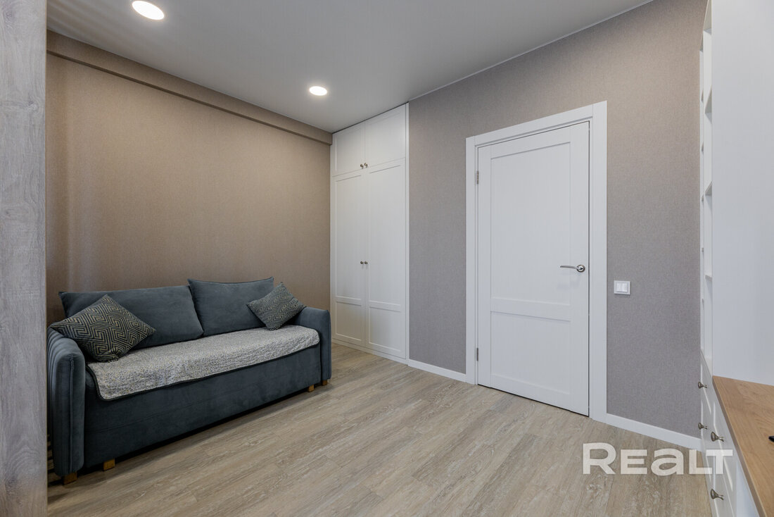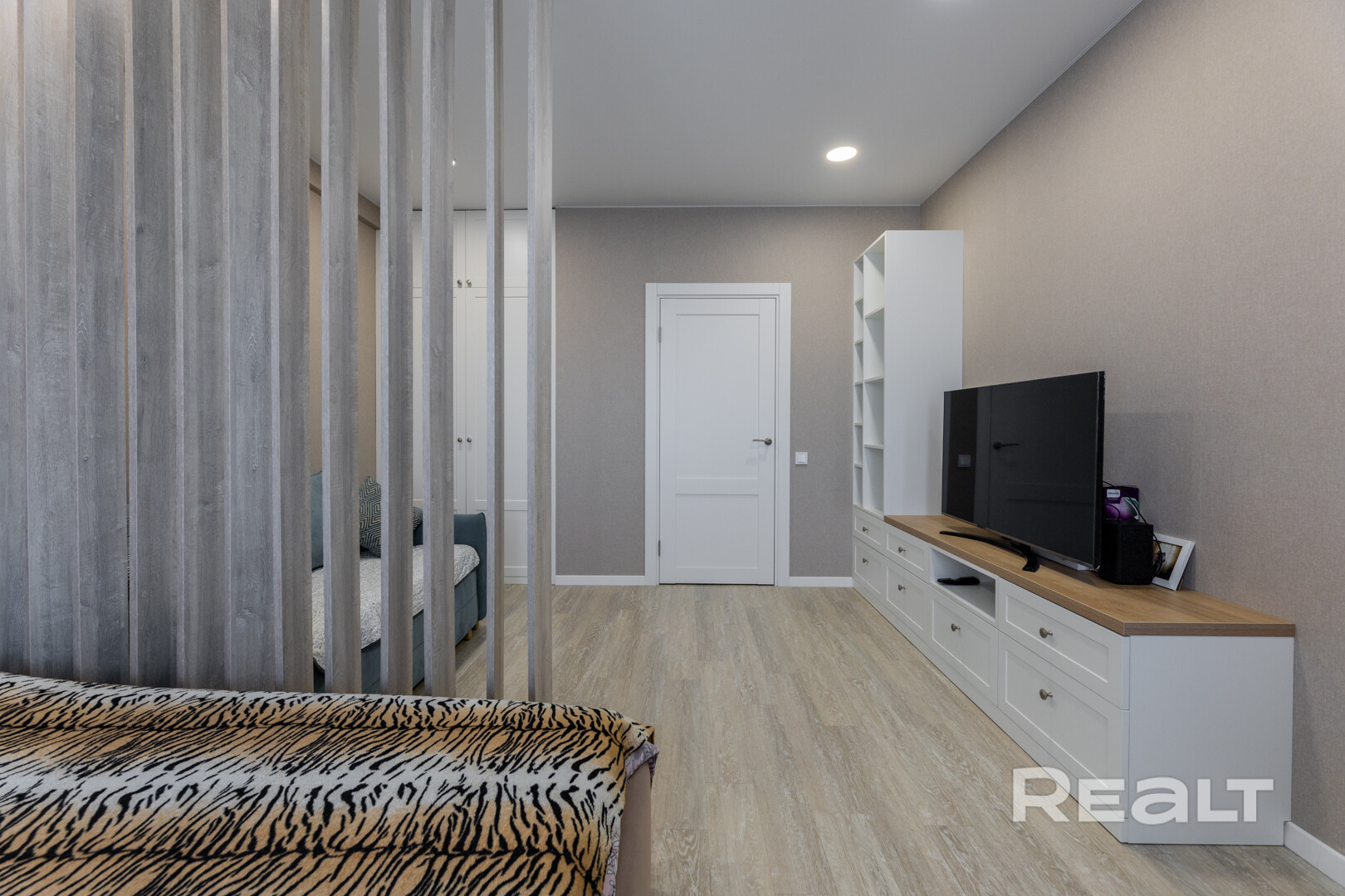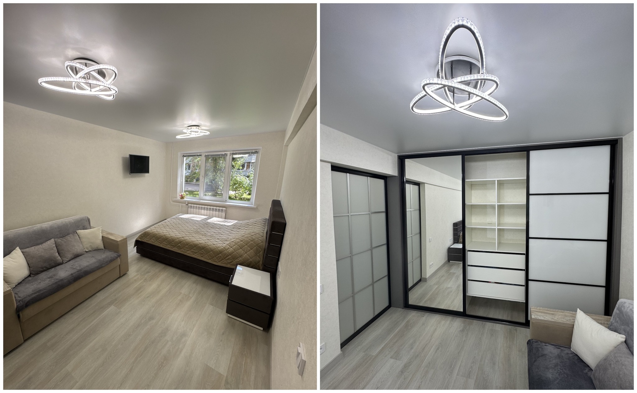 Квартира полностью готова к проживанию. Комната оклеена светлыми обоями. Потолки — натяжные. На полу лежит кварц-винил. Жилую часть тоже удалось разделить на две зоны.