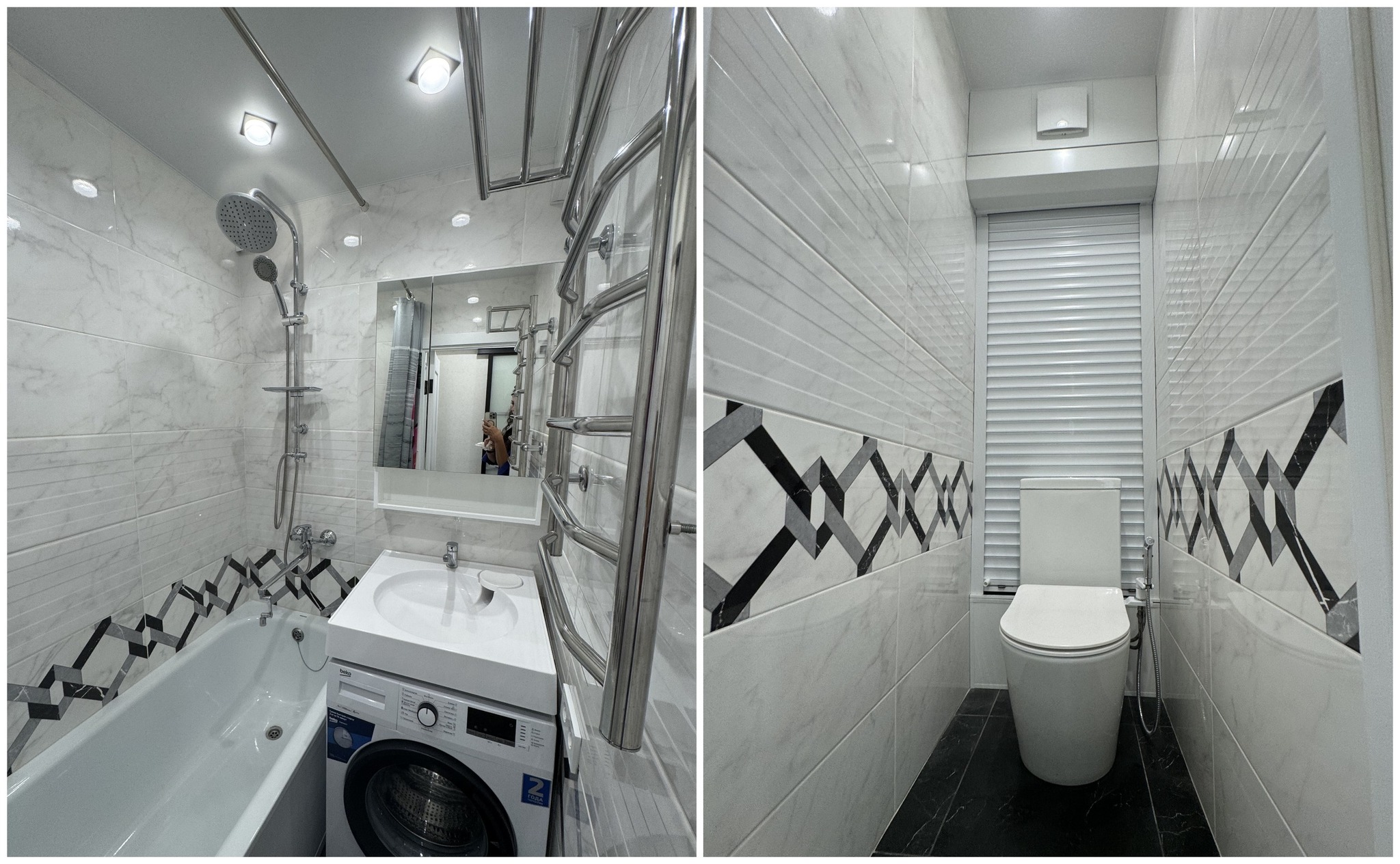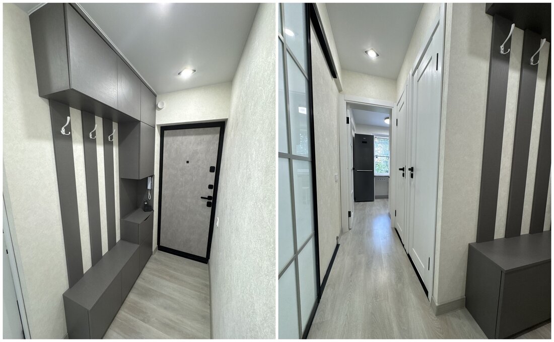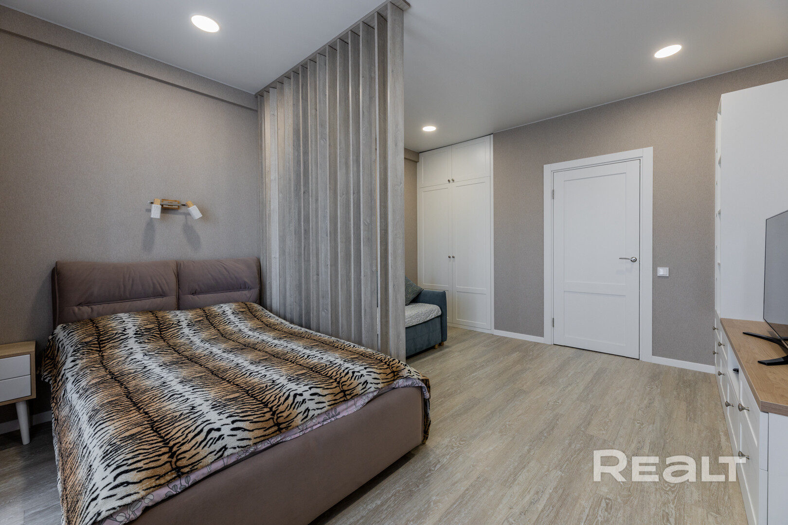 Квартира полностью готова к проживанию. Комната оклеена светлыми обоями. Потолки — натяжные. На полу лежит кварц-винил. Жилую часть тоже удалось разделить на две зоны.