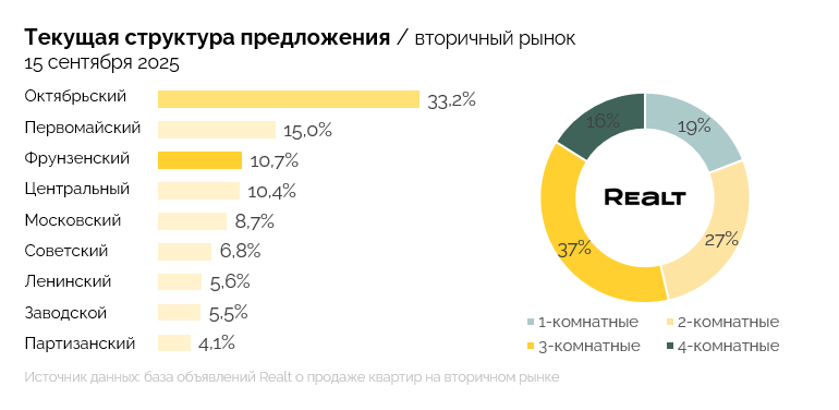 Динамика предложения по всем районам показала разнонаправленные изменения. Существеннее всего это коснулось Советского района — минус 4.7%, также Первомайского района — плюс 2.7%.