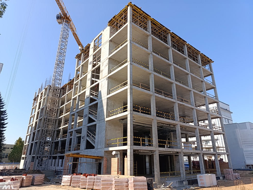 Новый корпус Минского онкоцента возводят на проспекте Независимости 64−10. Здание будет восьмиэтажным, строители уже перекрыли седьмой этаж. В планах до конца этого месяца возвести последний. Затем приступят к двухэтажным пристройкам: они запроектированы с двух сторон корпуса.
