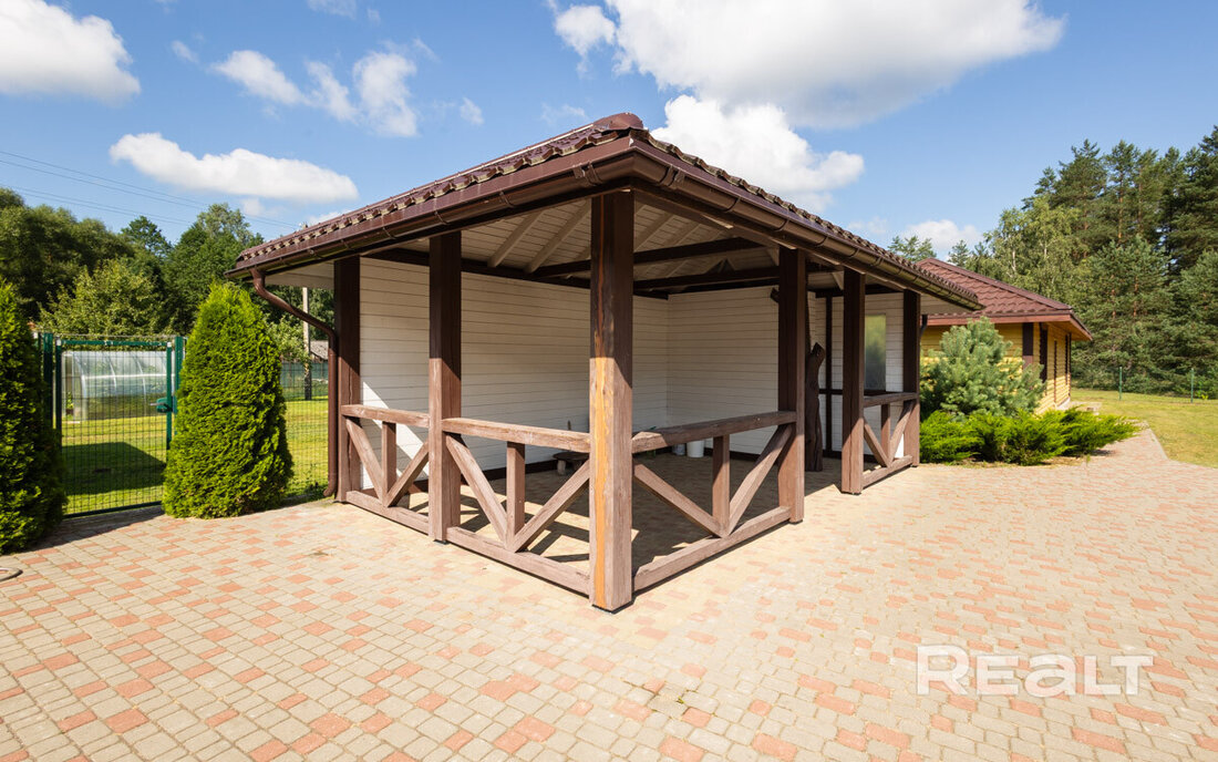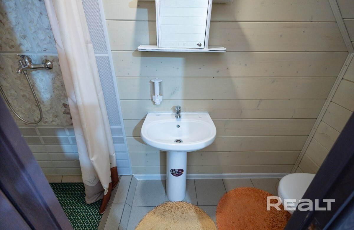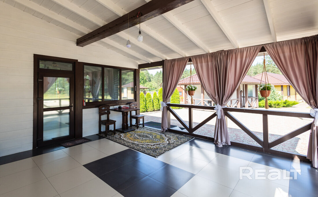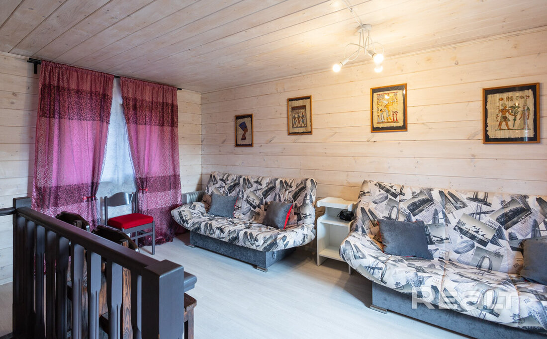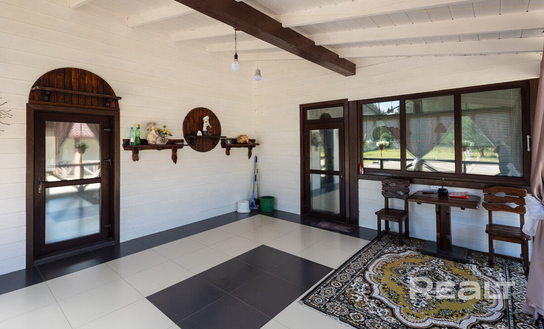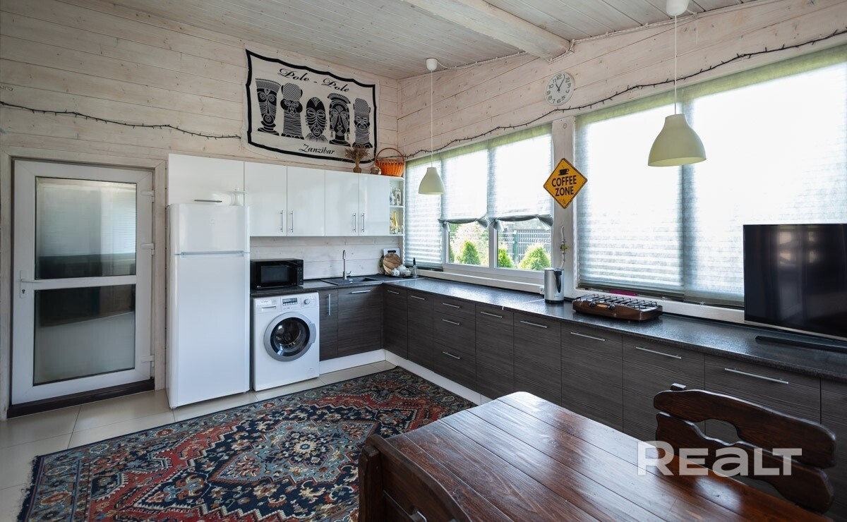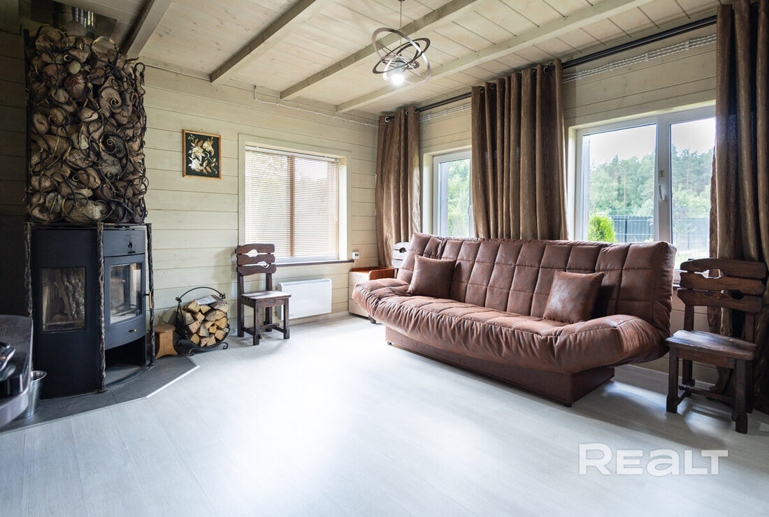 Внутри дом отделан натуральными материалами. Стены обшиты имитацией бруса и покрашены в светлые тона. Дом полностью меблирован и оборудован бытовой техникой.
