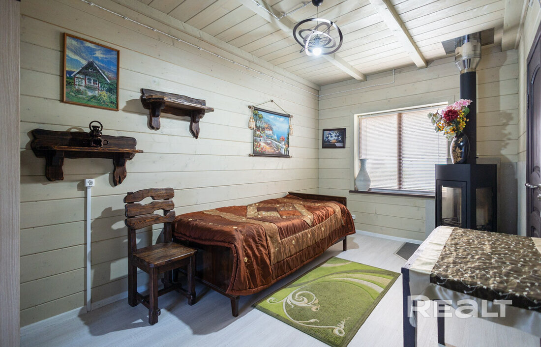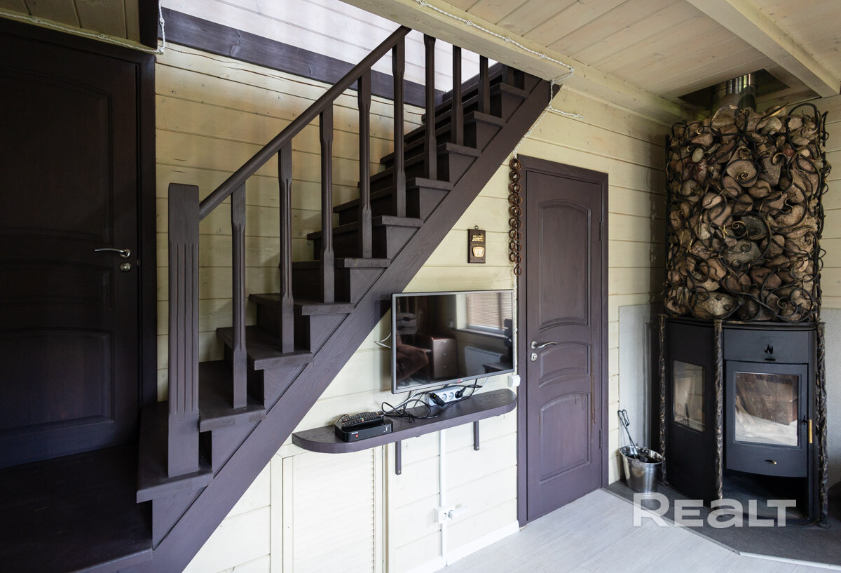 В гостиной находится уютная зона отдыха с печью-камином. На первом уровне так же расположены две спальни с окнами на озеро и санузел.