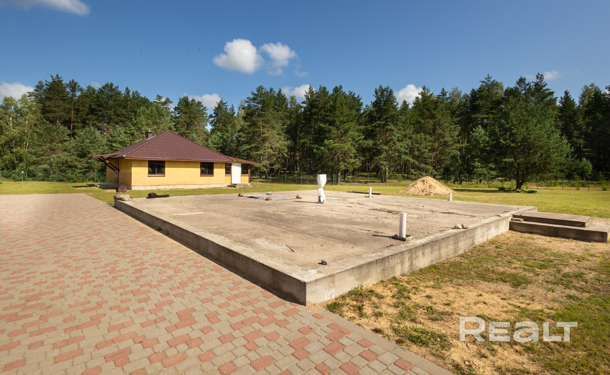 Рядом с домом — фундамент под гостевой дом с баней (120 м²). Ленточный фундамент, установленный на сваях, готов принять стены и крышу, а продуманная система водоснабжения и водоотведения, с тремя точками вывода в септик, значительно упростит строительство.