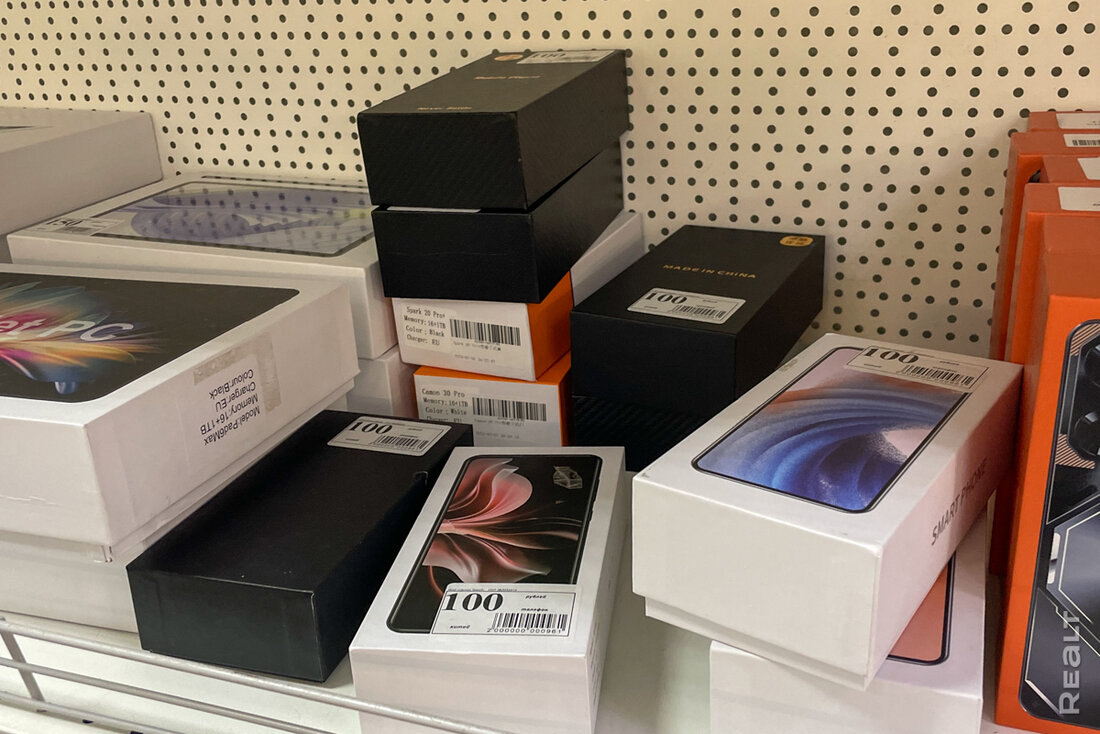 Хотя в коробках от телефонов, собственно, телефоны. В коробках от планшетов — планшеты. Все безымянные. Телефоны, в основном, стоят 100 рублей, а планшеты — 150.