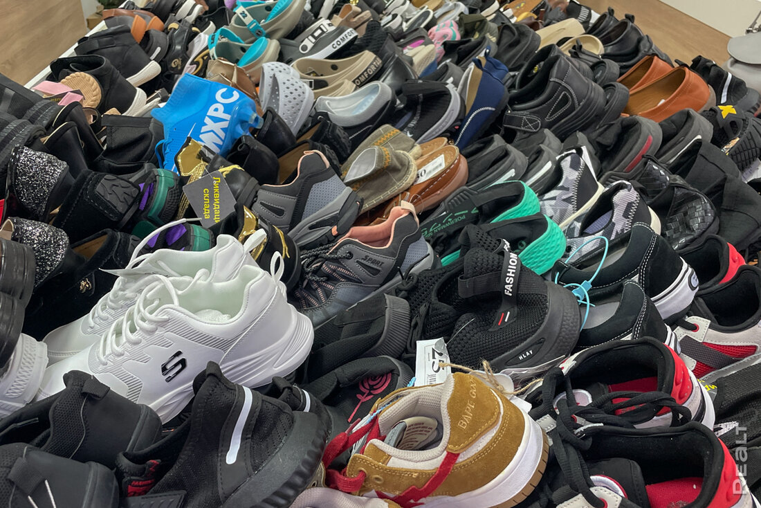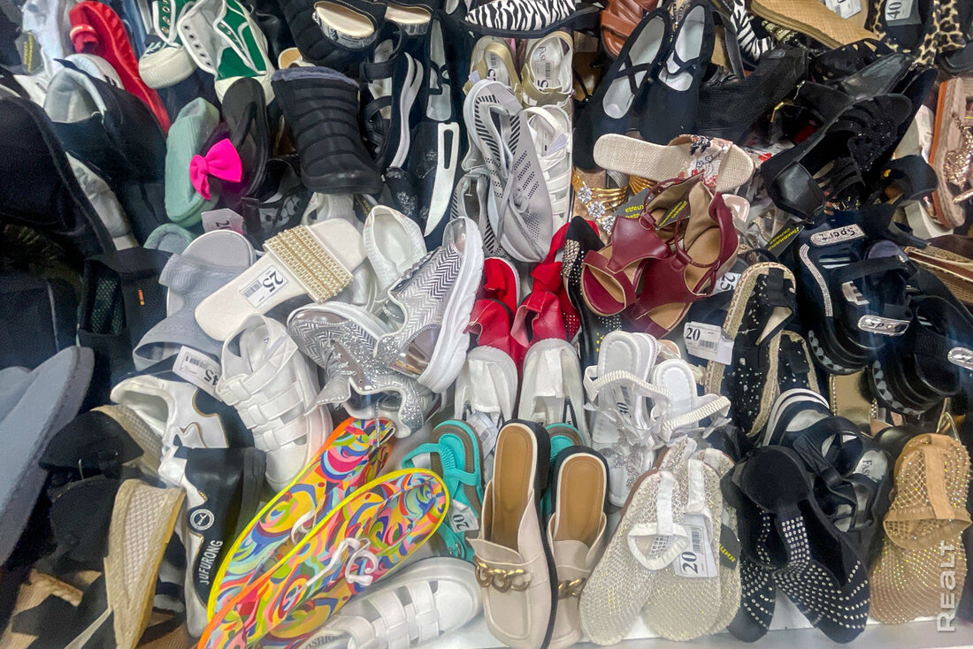 Отдельный стенд в магазине — это обувь. Здесь есть все от кроссовок до нарядной обуви со стразами. В определенные дни цены на обувь фиксированная. Мы попали, когда любую пару можно было купить за 20 рублей.