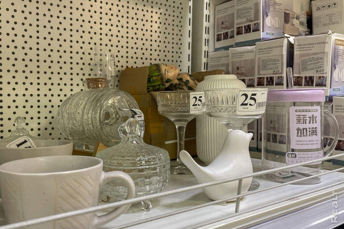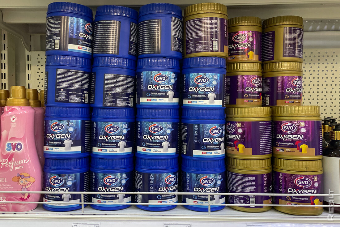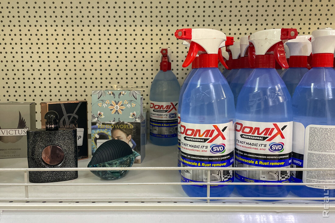 Сразу у входа, на полках справа выставлена бытовая химия. За 10 рублей продается литровая упаковка средства от известкового налета, столько же стоит средство от жирных пятен. Популярный нынче кислородный отбеливатель обойдется в 15 рублей за 750-граммовую банку. Средства для стирки — в больших объемах — 20−25 рублей за 2,7 литра. Вся бытовая химия, написано на этикетках, приехала из Турции. На других же товарах практически всюду будет Китай.