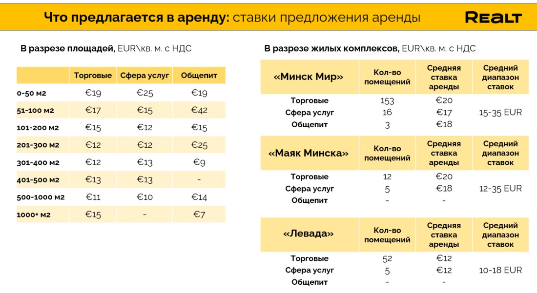 Актуальные арендные ставки на коммерческую недвижимость в Минске находятся в широком диапазоне. В отдаленных районах (Чижовка, Сухарево, Ангарская), в старом жилфонде и в помещениях, требующих значительных вложений, можно найти предложения от 5 EUR (18 рублей) за квадратный метр. Премиальные локации в центре города и в популярных жилых комплексах, таких как Минск-Мир и «Маяк Минска», достигают 15−35 EUR (54−127 рублей) за квадратный метр.