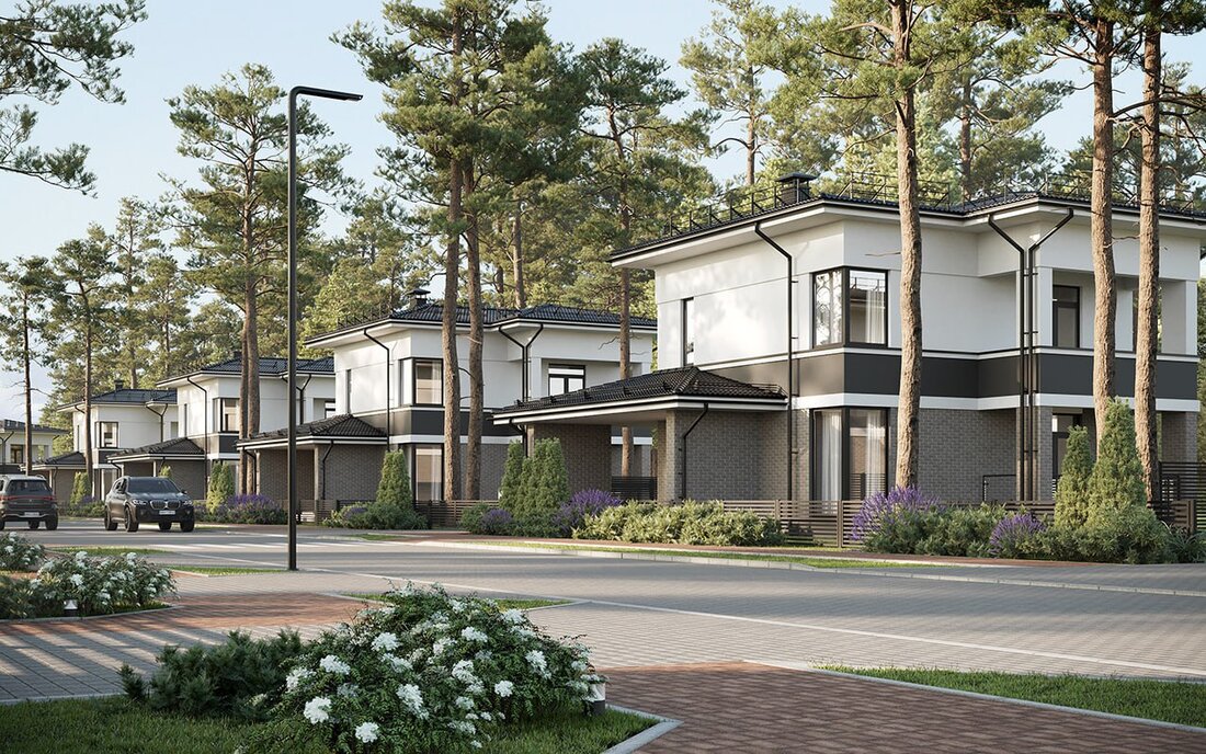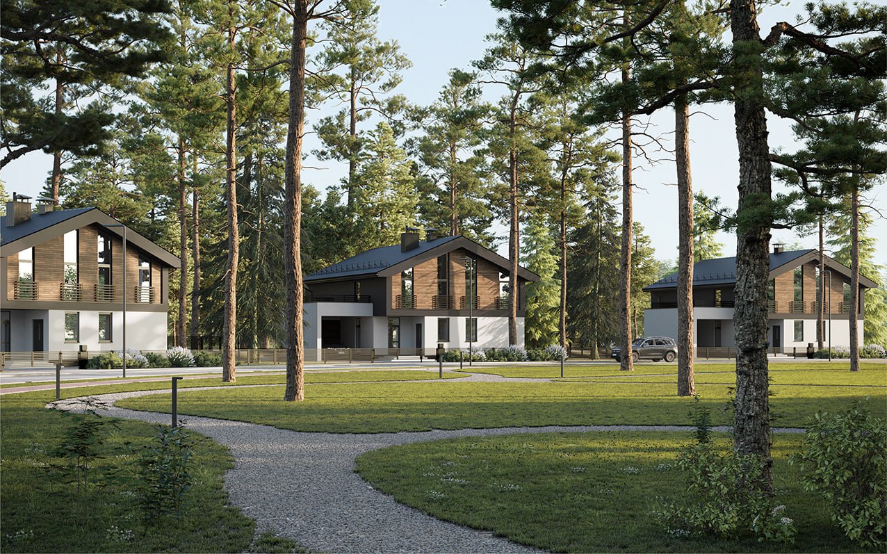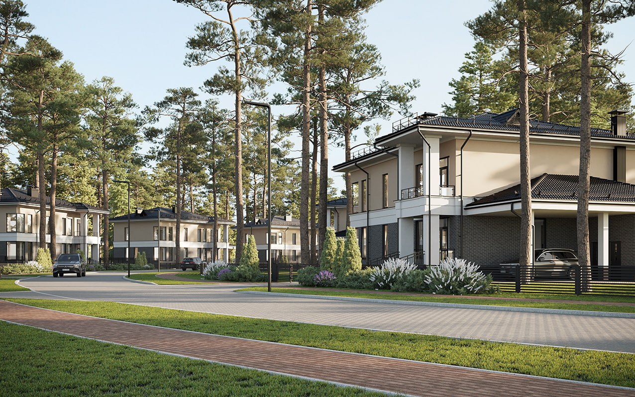 Коттеджи возводят по индивидуальным проектам — одно- и двухэтажные, общей площадью от 130 до 270 квадратов. Они идут с террасами, просторными гостиными, несколькими спальнями, санузлами и гардеробными. Встречаются даже с баней-сауной и вторым светом. Запроектированы также крытые навесы для авто.
