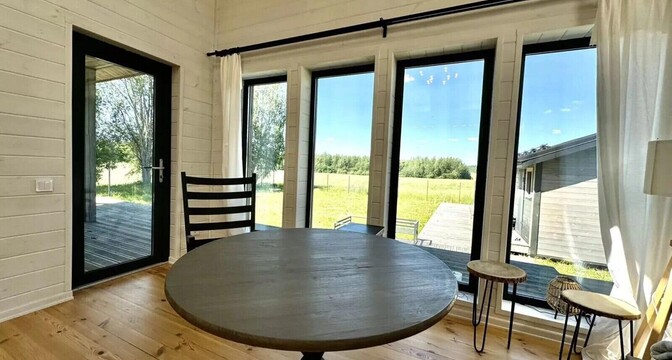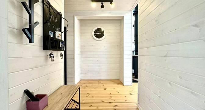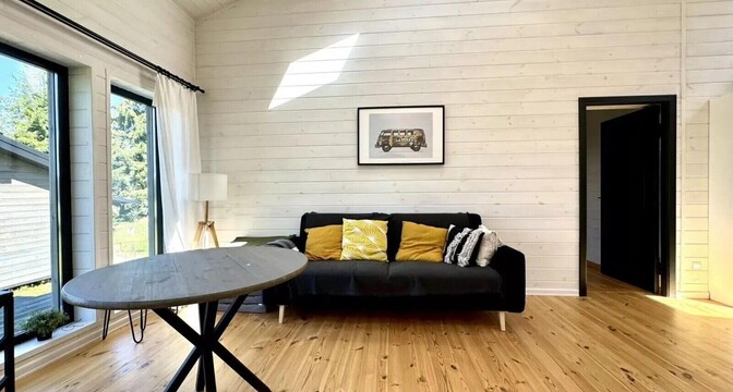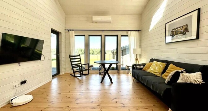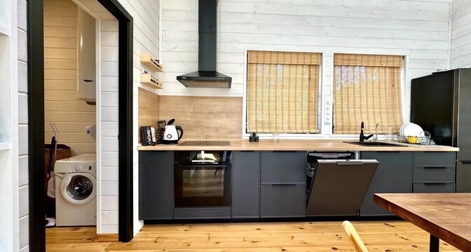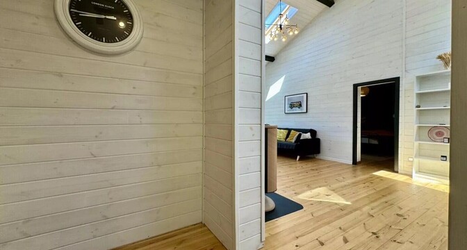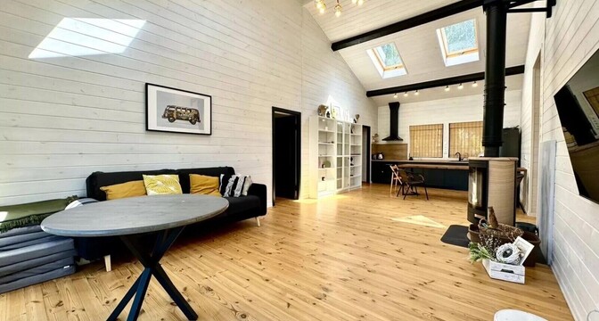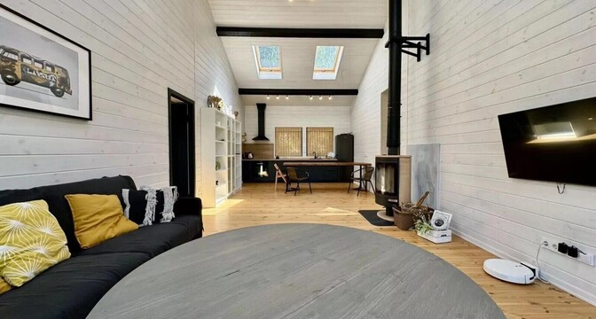 Внутри все комнаты также отделаны деревом. Самое большое помещение — кухня-гостиная, где стоит печь с камином. Высота потолков достигает 6 метров, установлены мансардные окна.