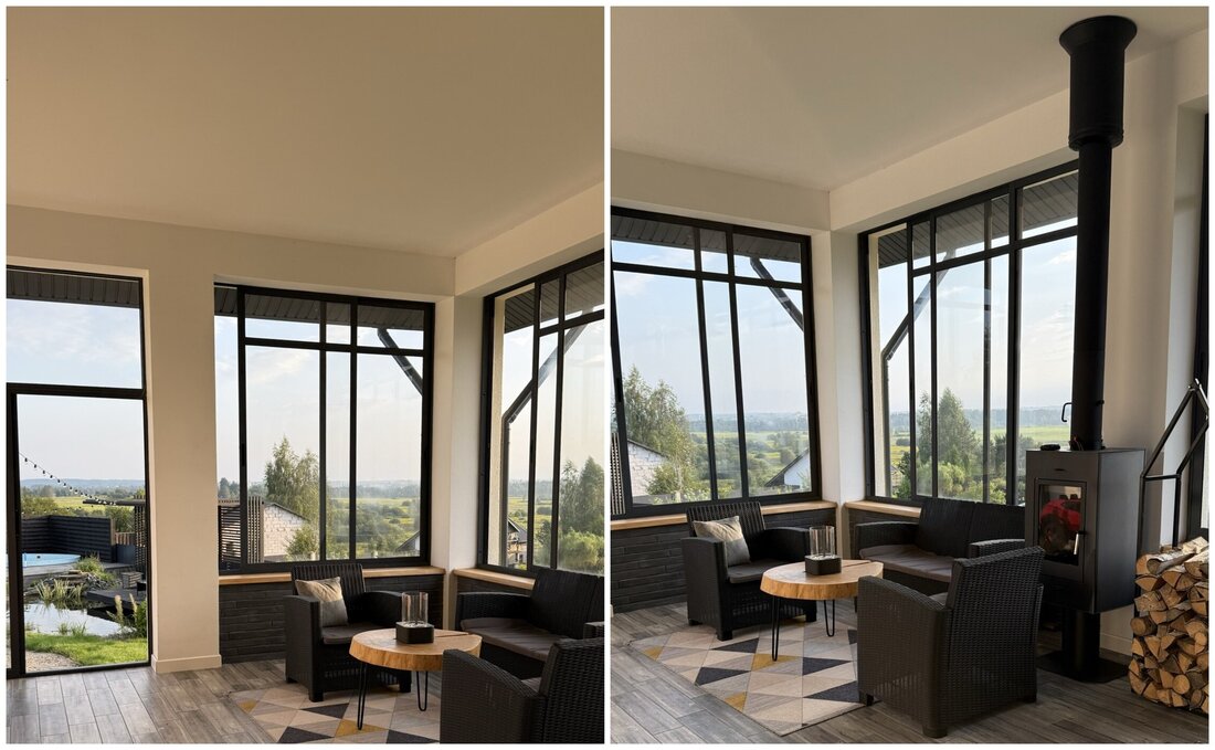 Самым популярным местом для вечерних посиделок точно будет терраса с печью-камином. Отсюда открывается красивый вид на участок и деревню. Ничего не помешает наслаждаться пейзажем, так как она застеклена в пол.