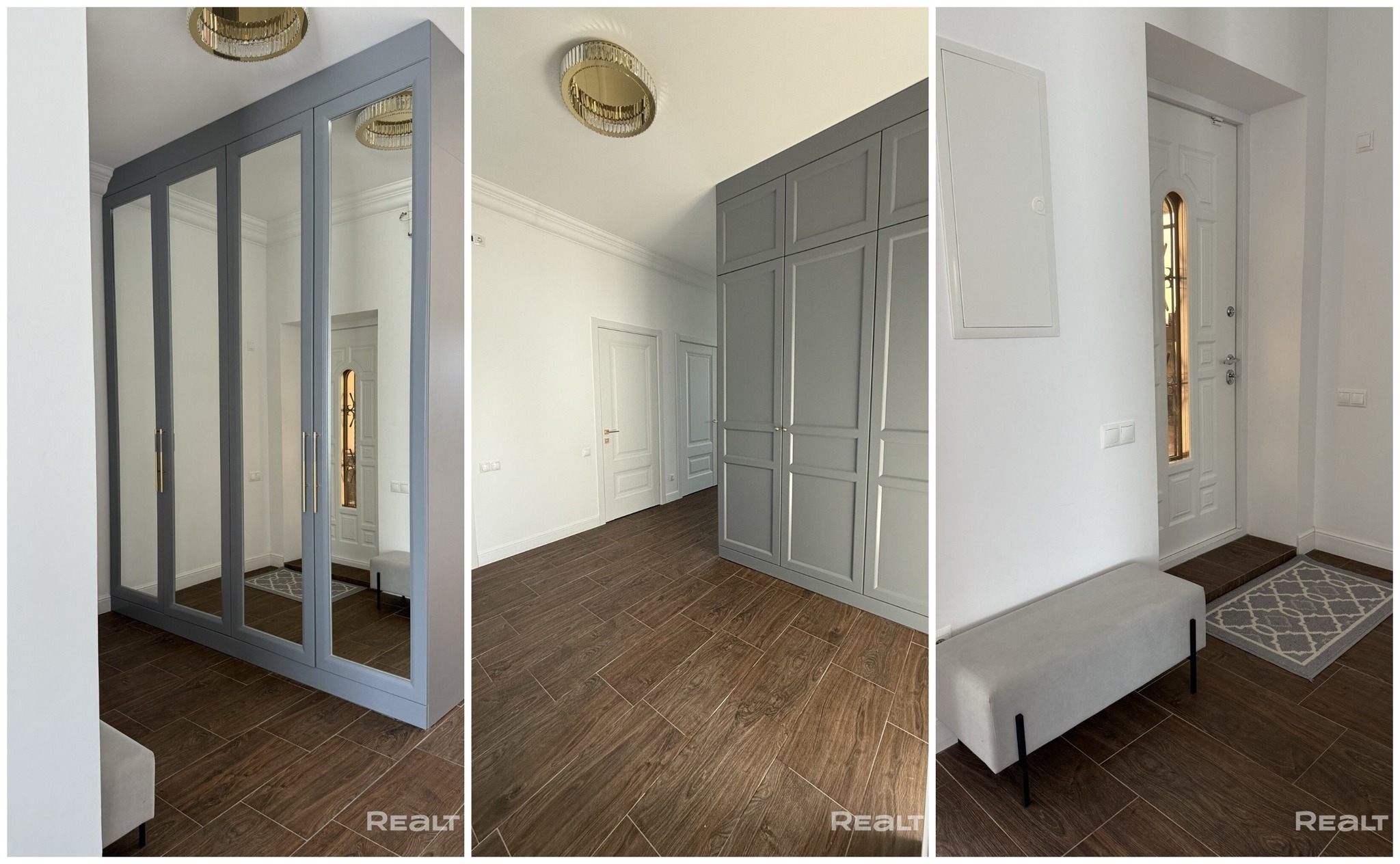 Внутри сделан светлый ремонт. Самая большая комната — совмещенная кухня-гостиная. Тут имеется вместительный кухонный гарнитур со встроенной бытовой техникой, в зоне отдыха расставлена мягкая мебель. В прихожей — шкаф.