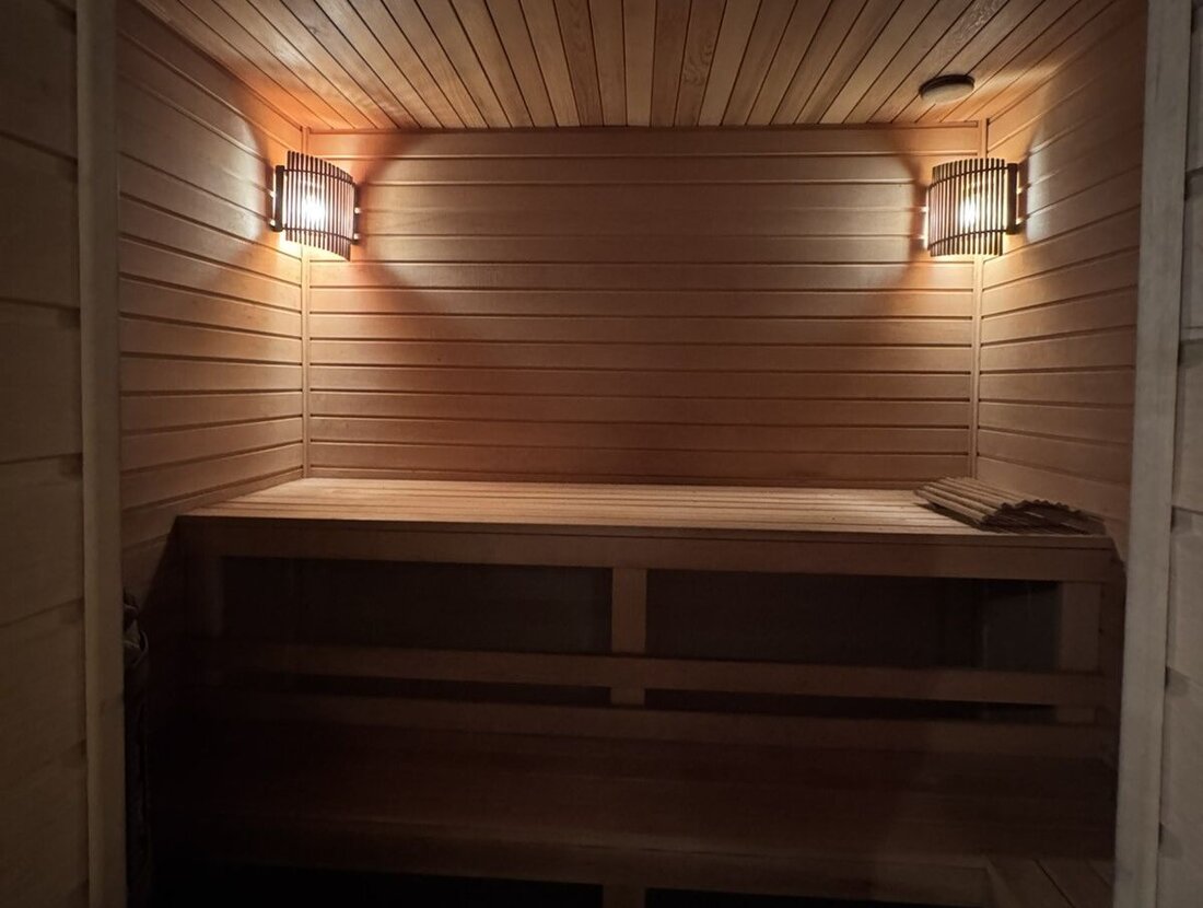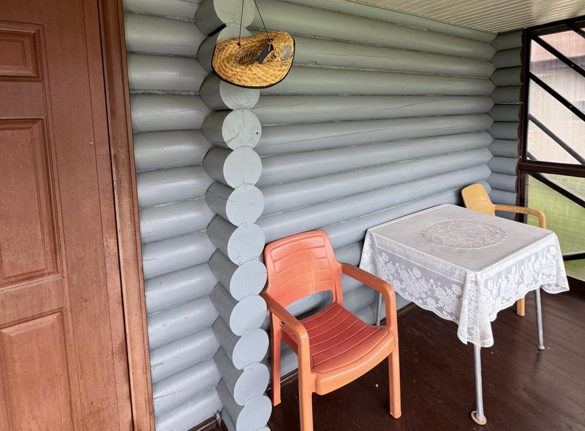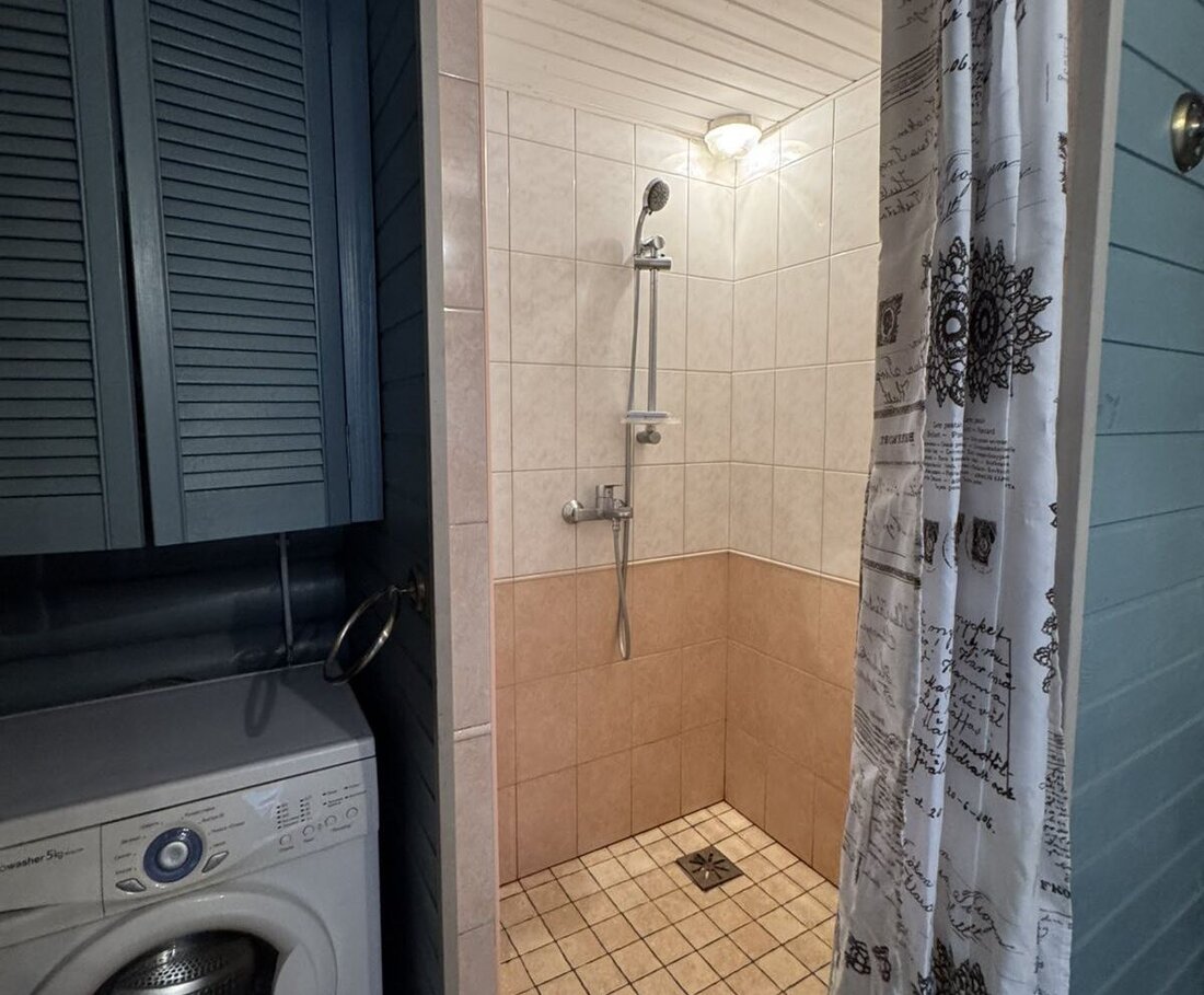 Здесь тоже хороший ремонт — стены покрашены, на полах и в санузле — плитка. Снаружи к бане пристроена крытая терраса.