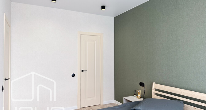 Общая площадь — 37 квадратов. В квартире современный ремонт в светлых тонах. Акцентным цветом выбрали зеленый — в спальне одна из стен как раз в таком цвете.