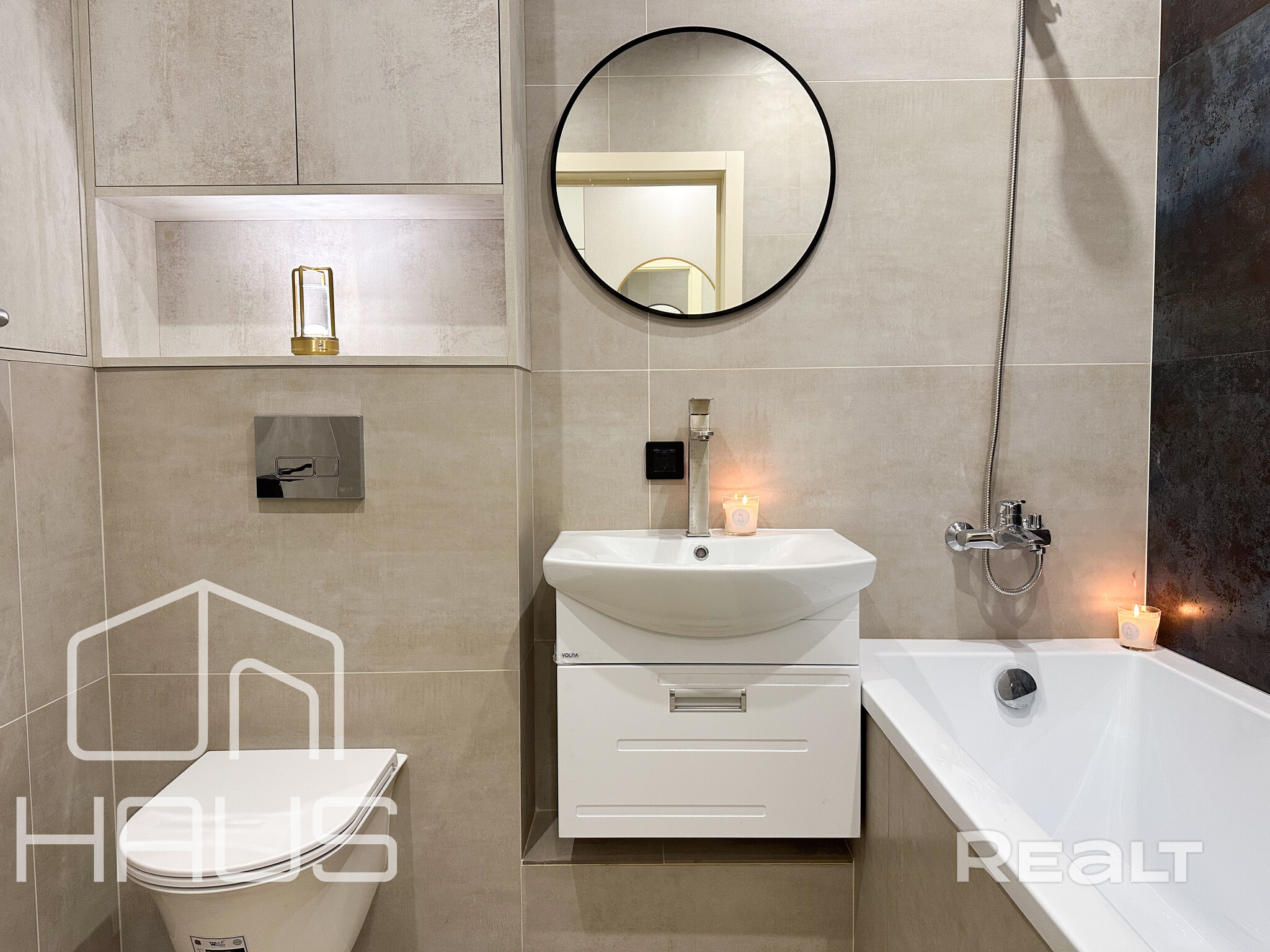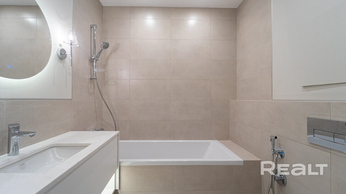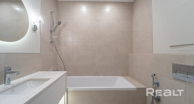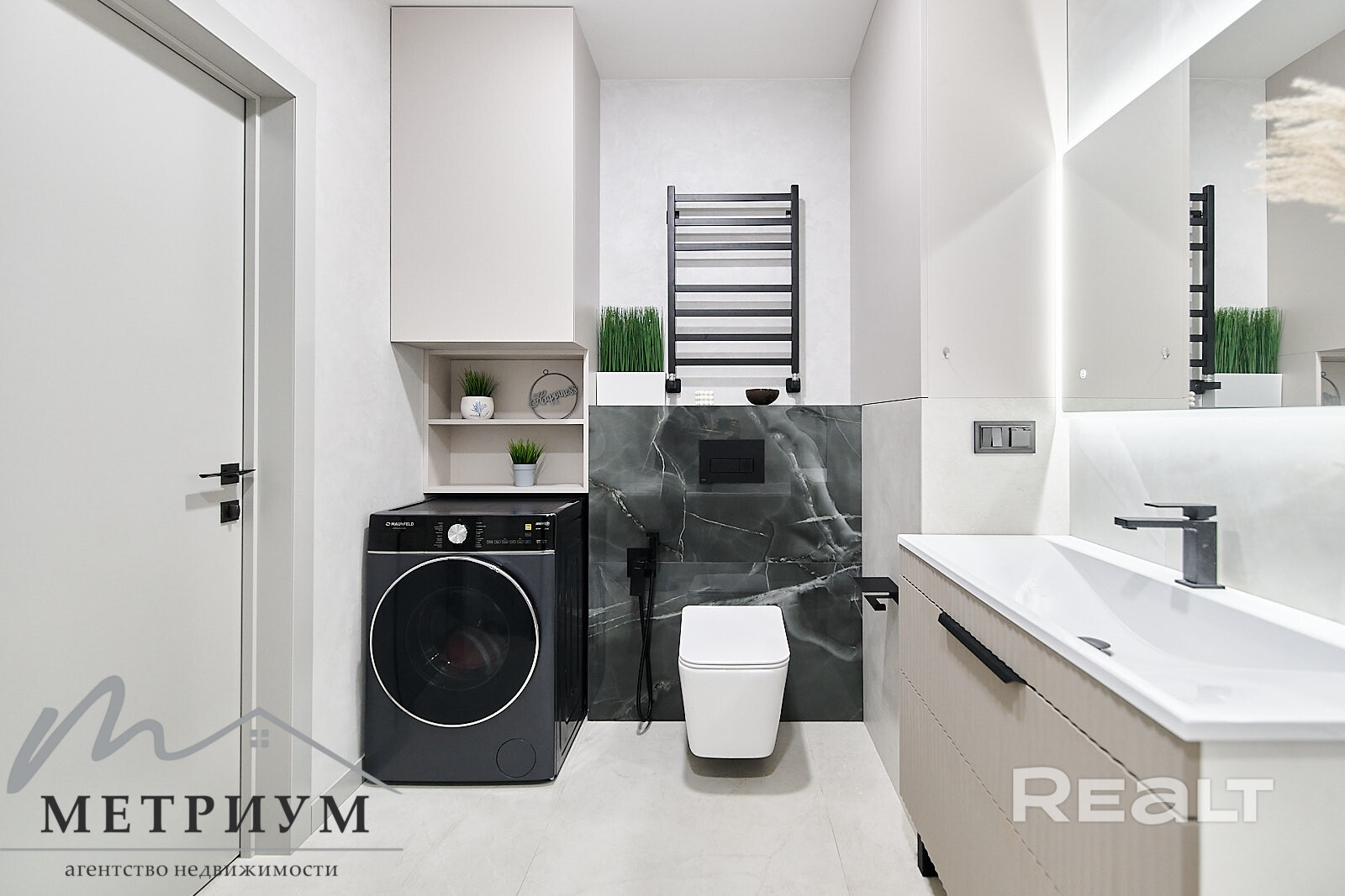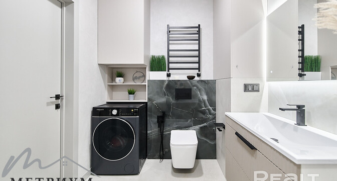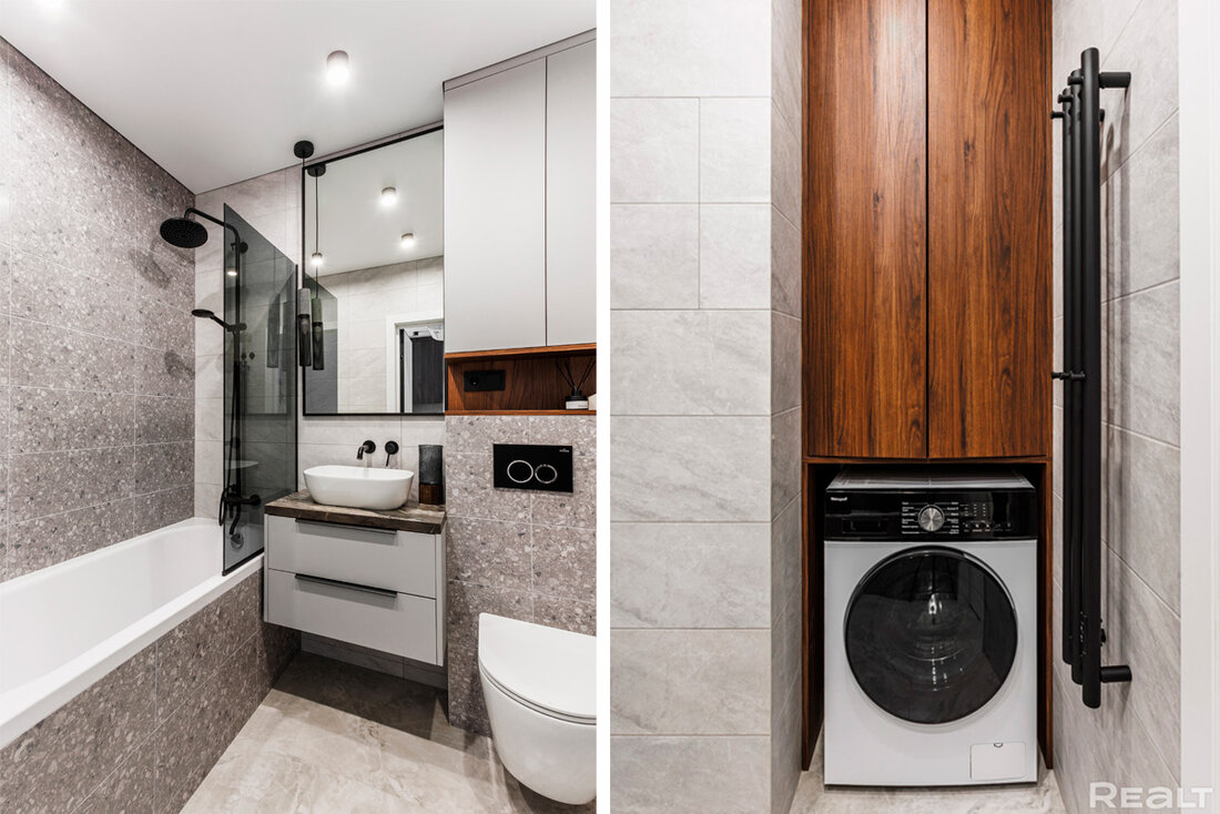 Санузел совмещенный. Установлена стирально-сушильная машина, проточный водонагреватель и электрический полотенцесушитель.