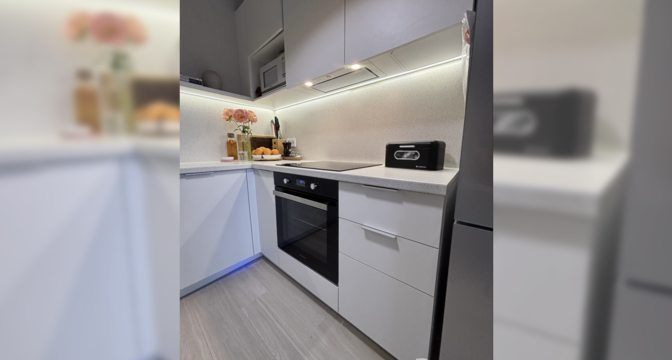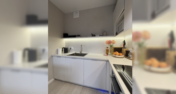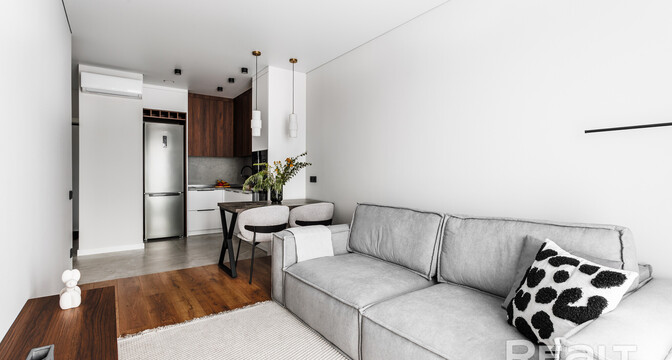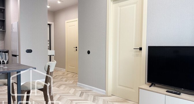 Общая площадь этой квартиры — 43 метра. В евродвушке отличный ремонт. Установлен кондиционер, а из техники в кухне есть посудомоечная машина, духовой шкаф, микроволновая печь, варочная панель и холодильник. А еще установлен фильтр для воды. В квартире панорамные окна и есть выход на лоджию.