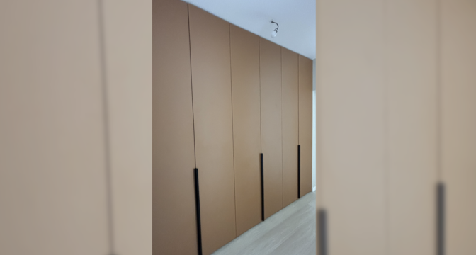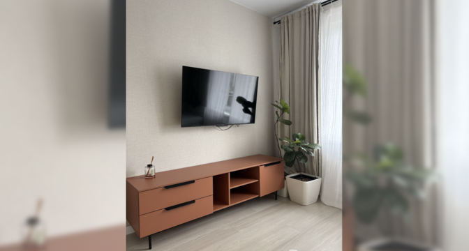 Общая площадь — 35 квадратов. В отдельной жилой комнате оборудована спальня, в которой есть выход на балкон. В ремонте используется яркий цвет — пыльно-оранжевый. Санузел совмещенный. Установлена ванна и стиральная машина.