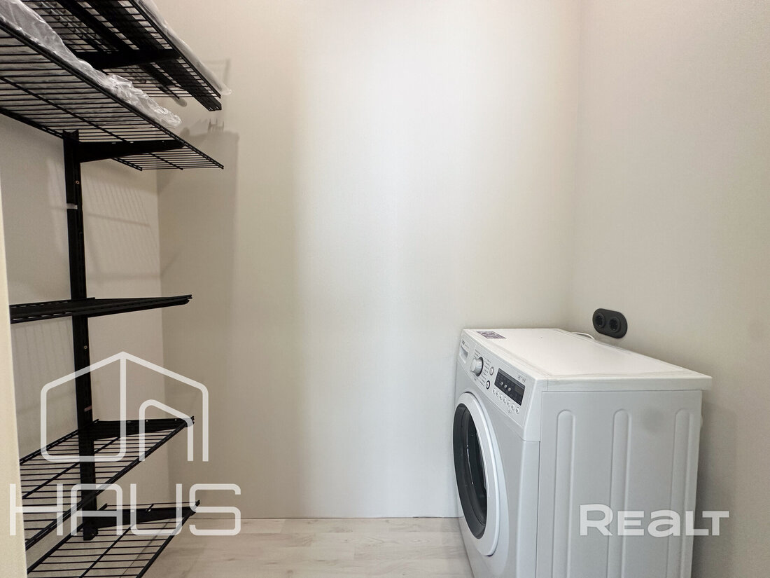 В кухне, совмещенной с гостиной, есть выход на застекленную лоджию. Есть кладовая-гардеробная, в которой подключена стиральная машина. А в совмещенном санузле установлена ванна.