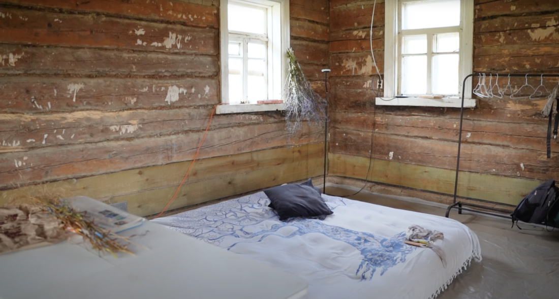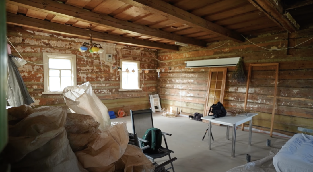 Девушка обращает внимание и на то, как у старых хозяев были поклеены обои. «Когда мы их содрали, удивились, что нет дранки и шпатлевки, как это обычно делается. Обои были просто приклеены по брусу. Но, понятное дело, все равно есть между брусами такие выемки — вот они были просто заклеены цементом. А чтобы он держался, сделали своеобразное армирование колючей проволокой. Она была прям старой. Как Миша говорит, надежной. Прибита к дереву, а по ней уже сделан небольшой цементный слой. Пока что в старой части дома мы хотим оставить брус и не прятать его. Но наши родственники с двух сторон отговаривают. Сейчас он выглядит некрасиво, нечищенный, немытый. Но все-таки будем пытаться что-то с ним сделать. Как минимум, сразу все не закатывать в гипсокартон или другой материал, потому что сам вид старого дерева нам нравится, просто нужно чуть терпения, и должно все получится. Я верю в эту идею».