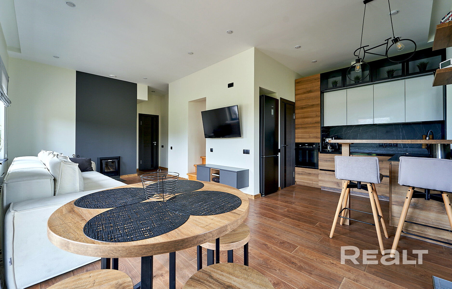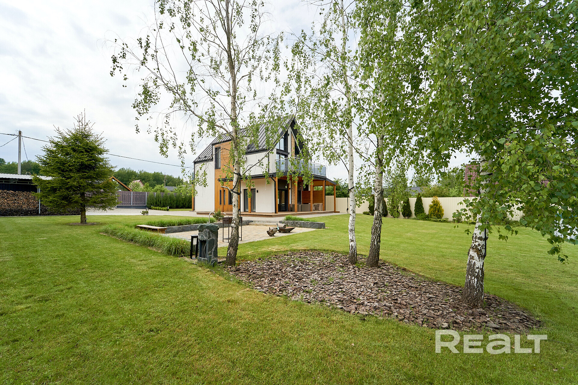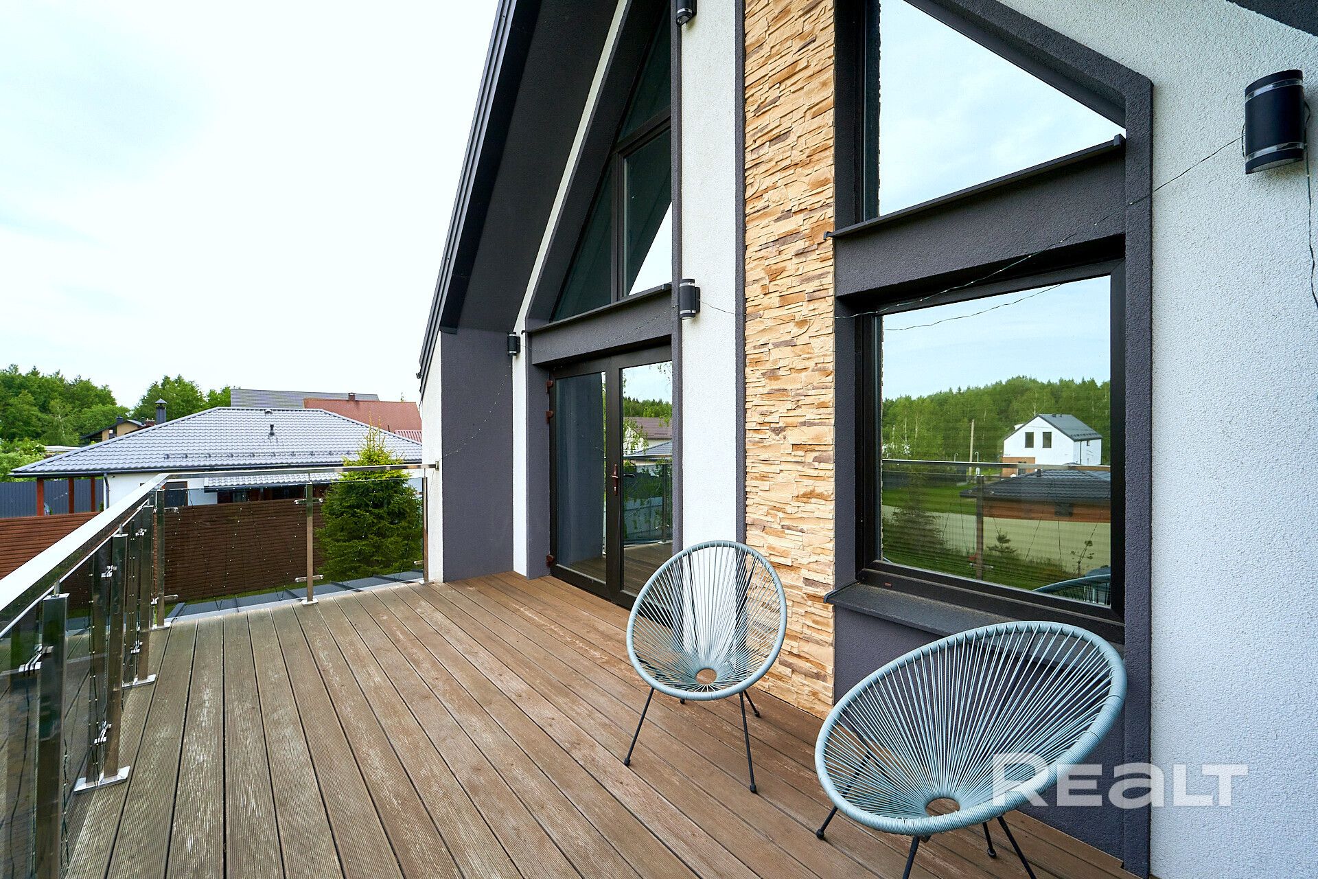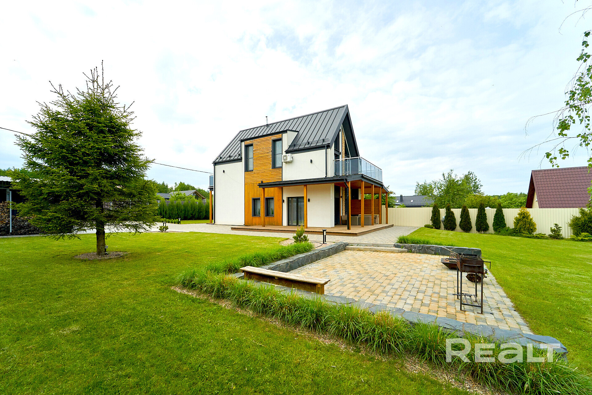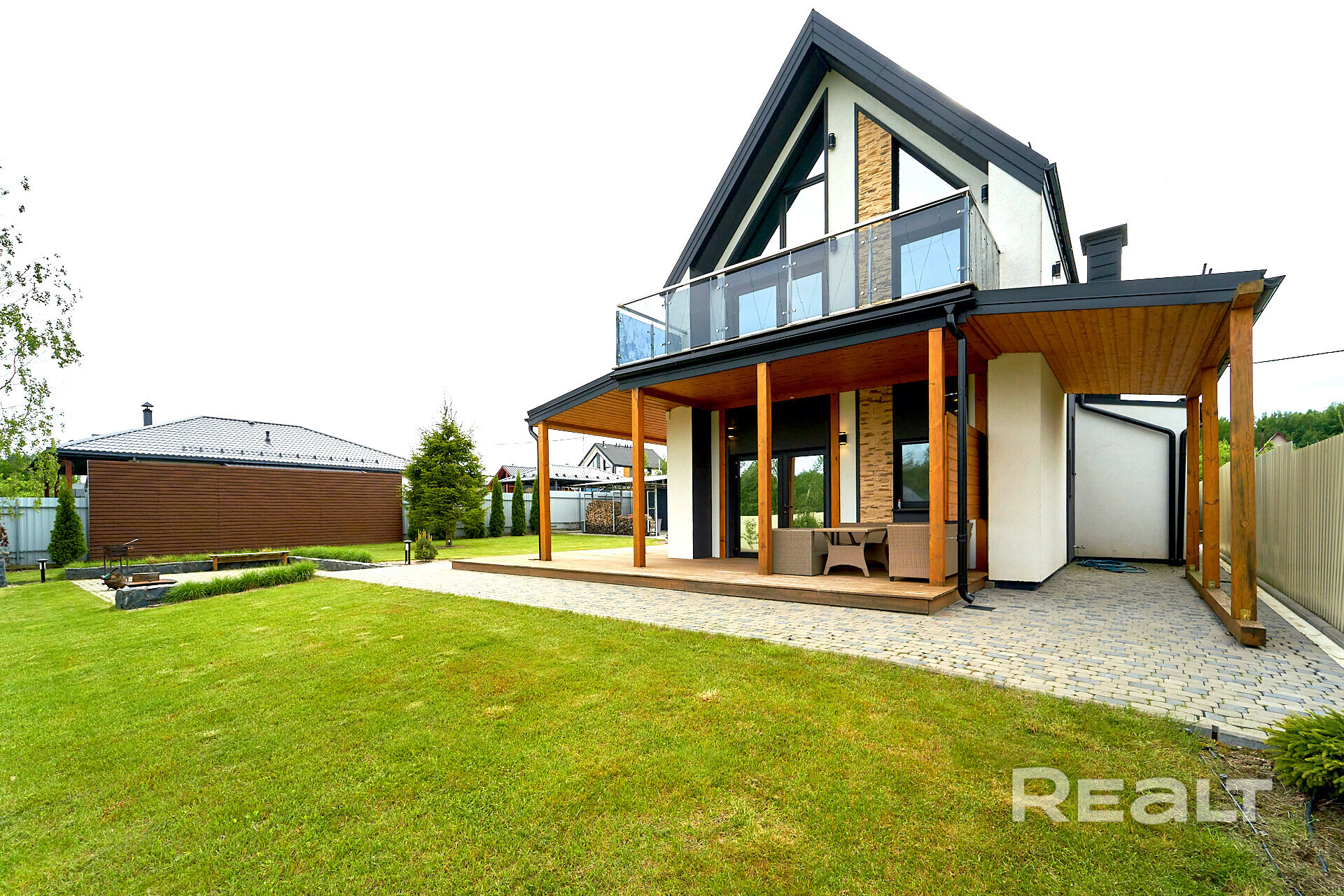 В Логойском районе продается современный двухэтажный дом. Внутри сделан хороший ремонт. Первый этаж занят общими зонами, в том числе и сауной. На втором расположились три спальни с выходом на террасы. Оцените дом почти за 200 тысяч долларов.