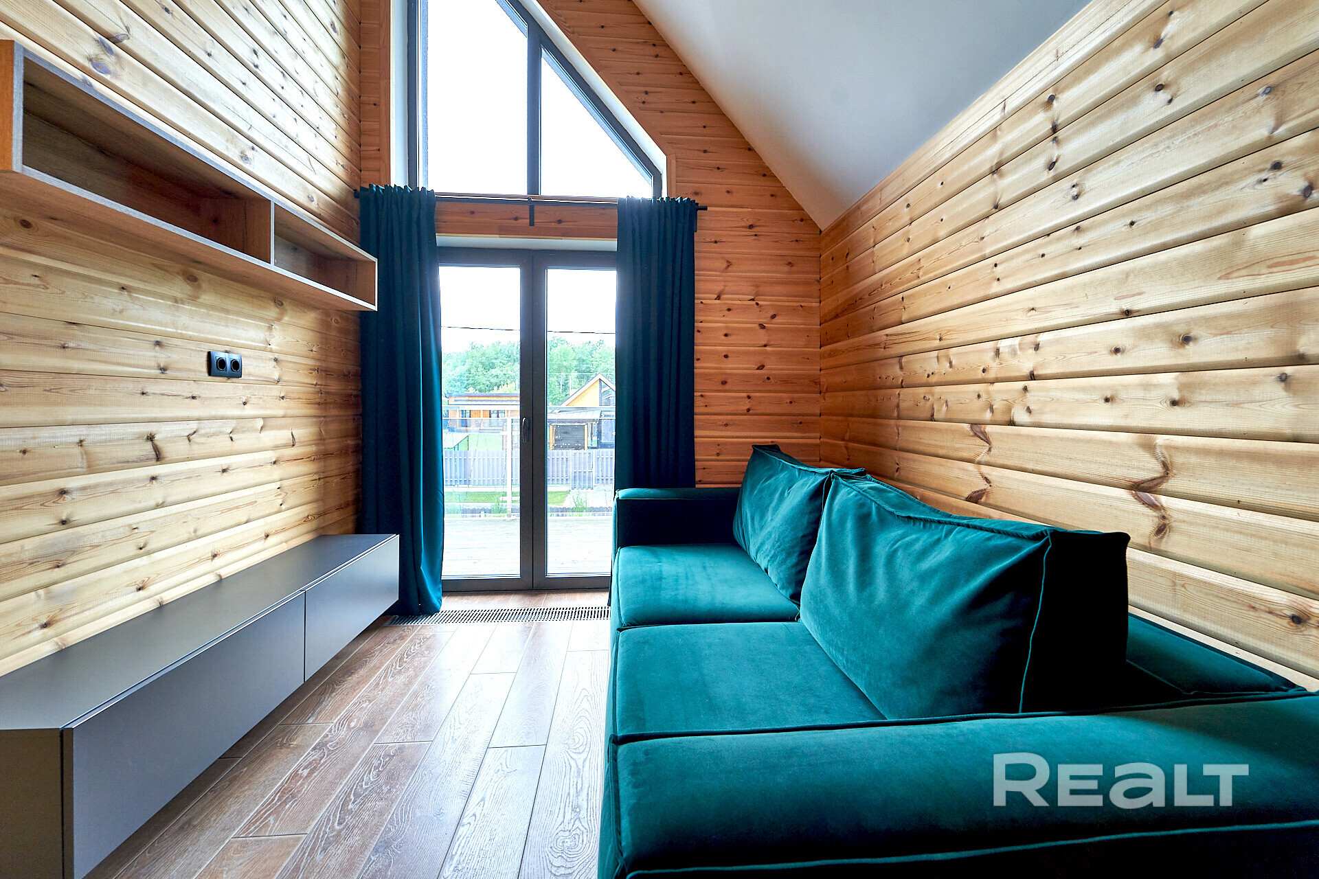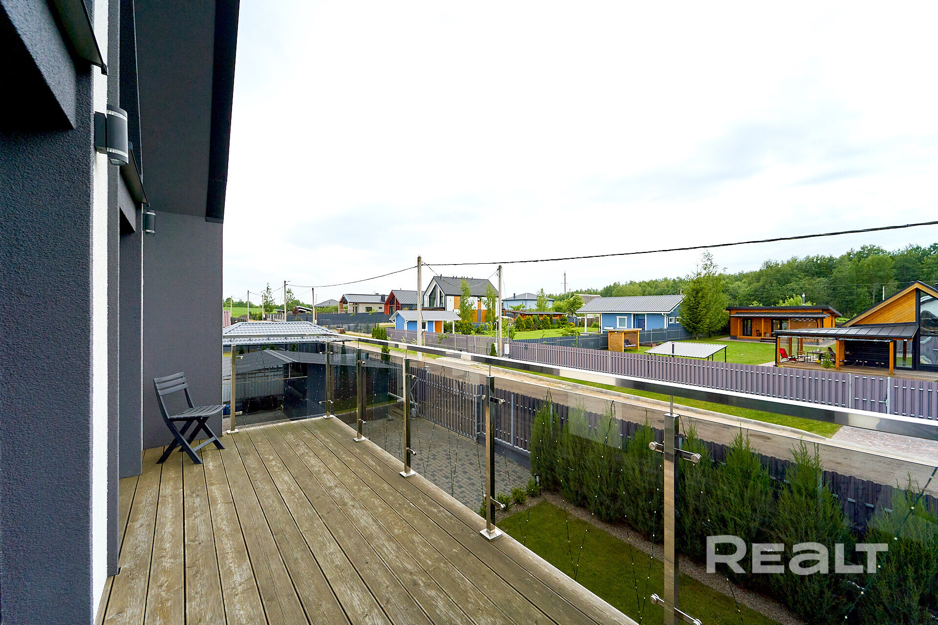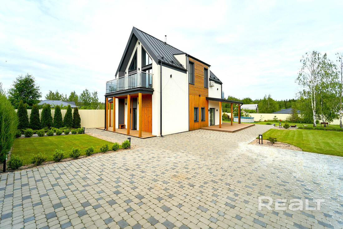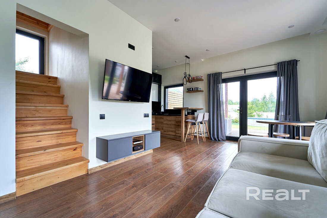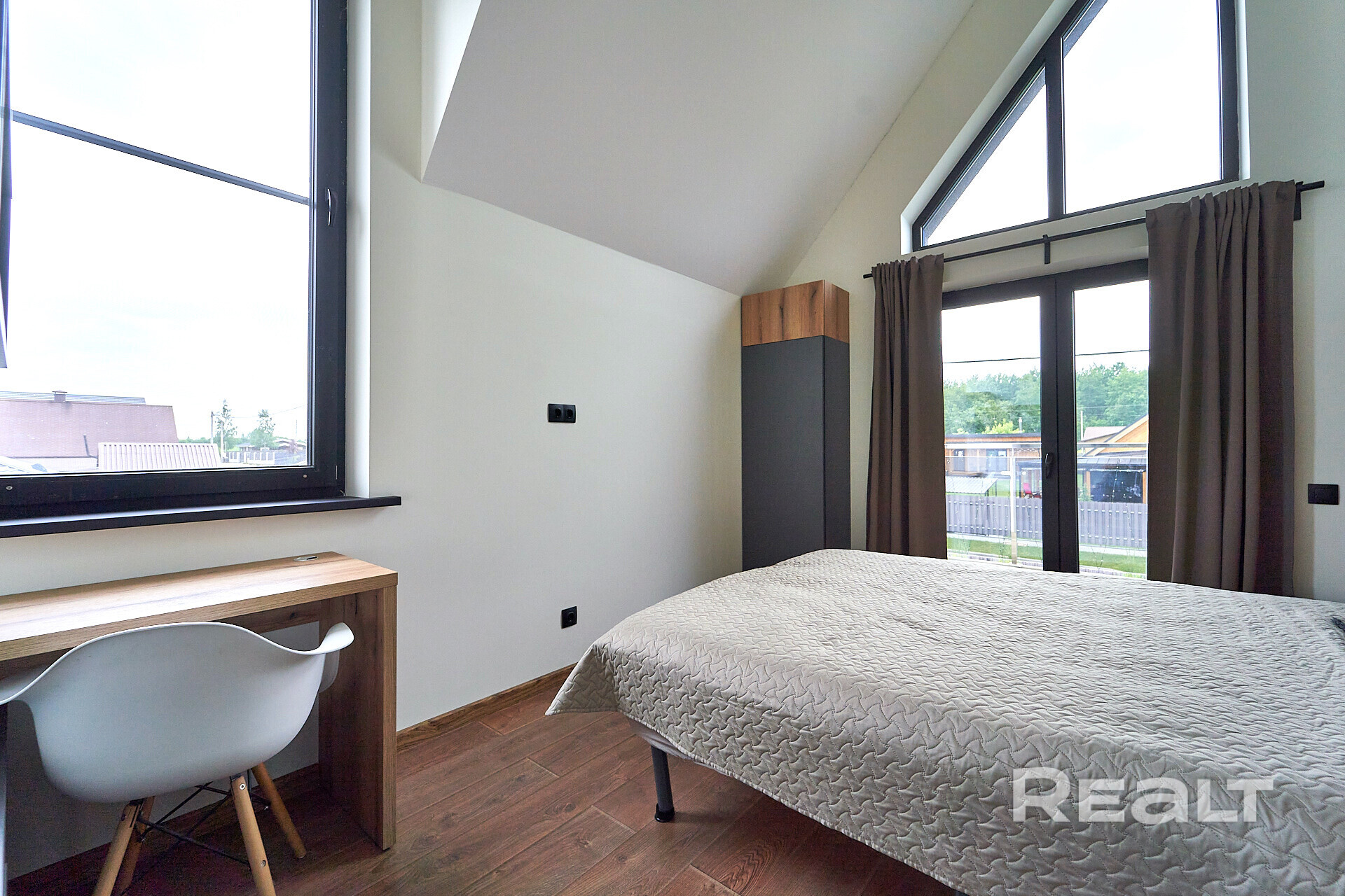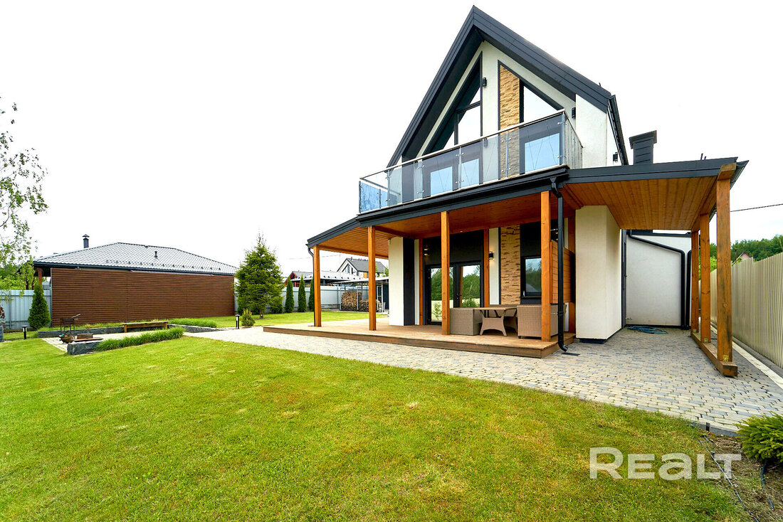 В Логойском районе продается современный двухэтажный дом. Внутри сделан хороший ремонт. Первый этаж занят общими зонами, в том числе и сауной. На втором расположились три спальни с выходом на террасы. Оцените дом почти за 200 тысяч долларов.
