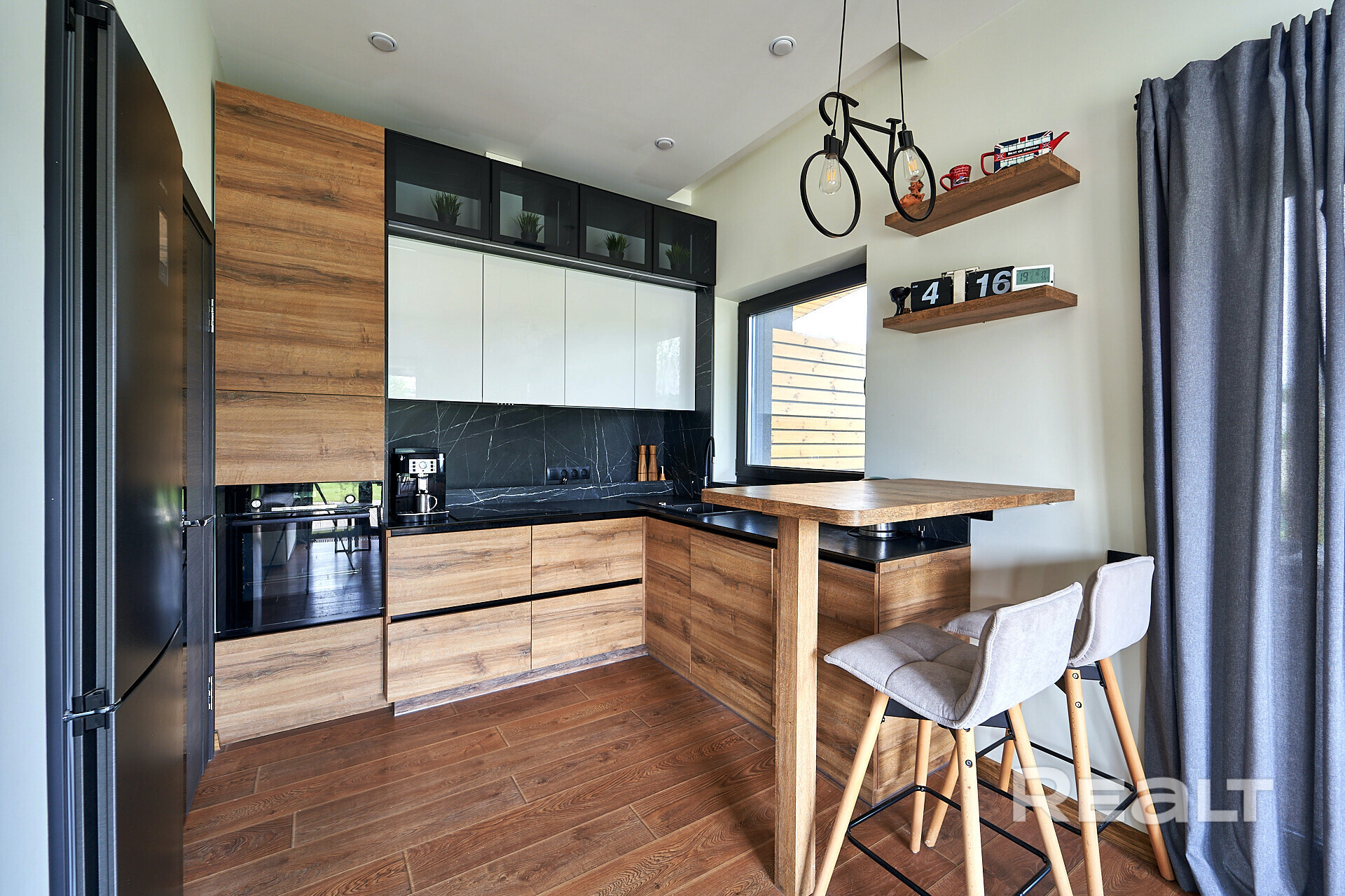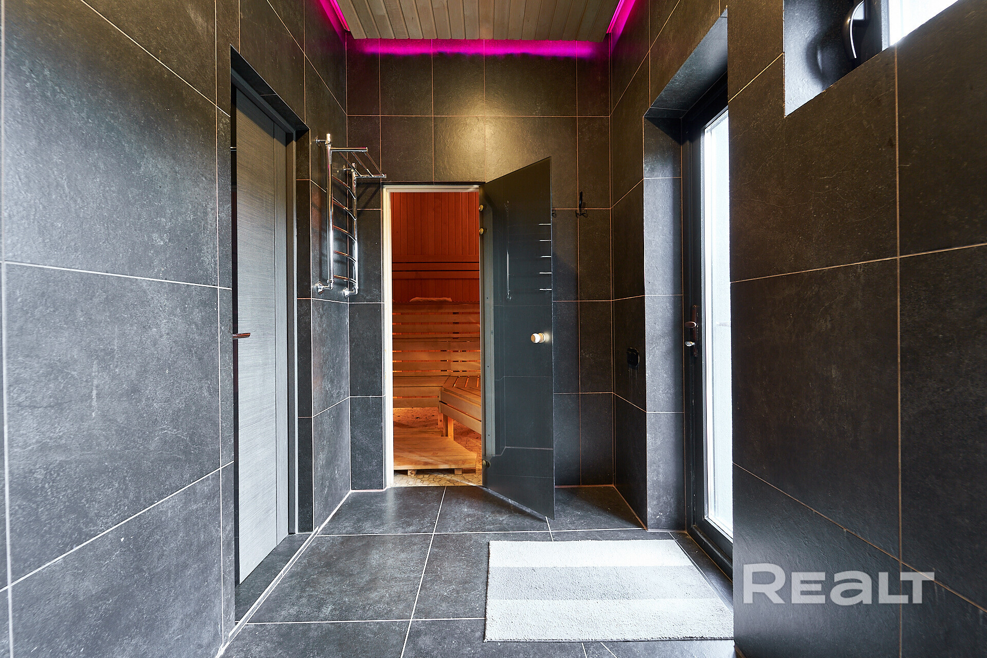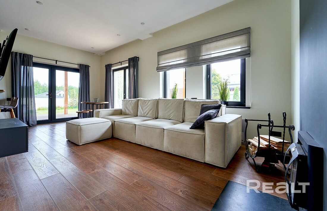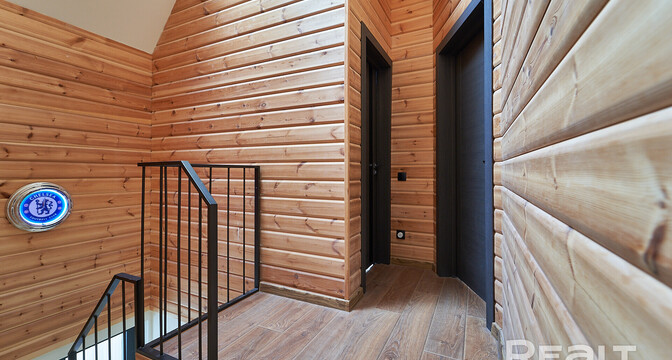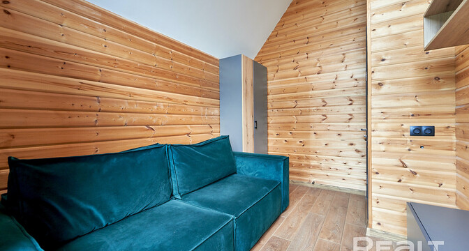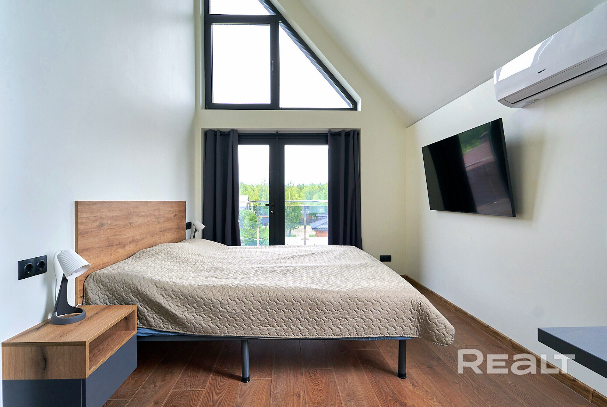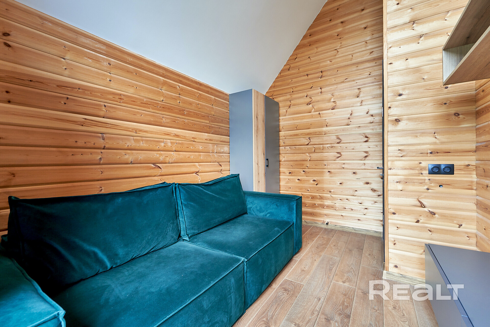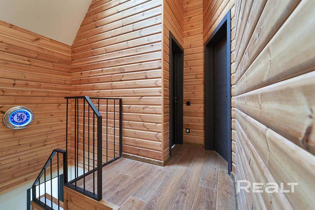 В Логойском районе продается современный двухэтажный дом. Внутри сделан хороший ремонт. Первый этаж занят общими зонами, в том числе и сауной. На втором расположились три спальни с выходом на террасы. Оцените дом почти за 200 тысяч долларов.