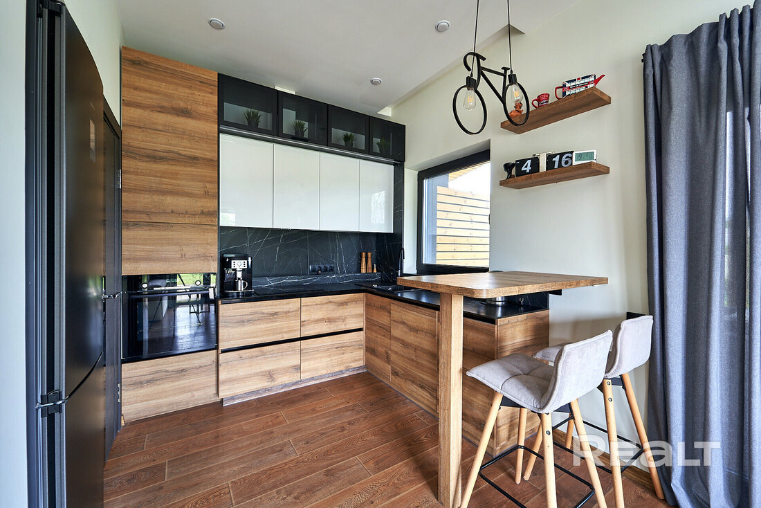 Внутри сделан хороший ремонт. На первом этаже обустроена кухня-гостиная, санузел и прачечная.