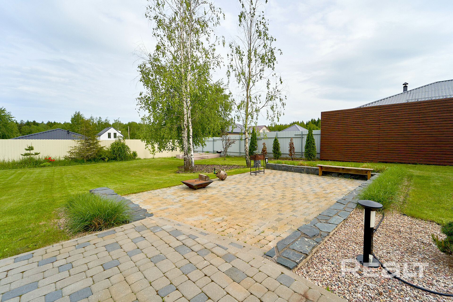 Участок занимает 11,3 сотки. Он огорожен забором с распашными воротами. Тут сделаны дорожки, зона барбекю, дровница, хозяйственная постройка. Стоит на участке и бассейн.