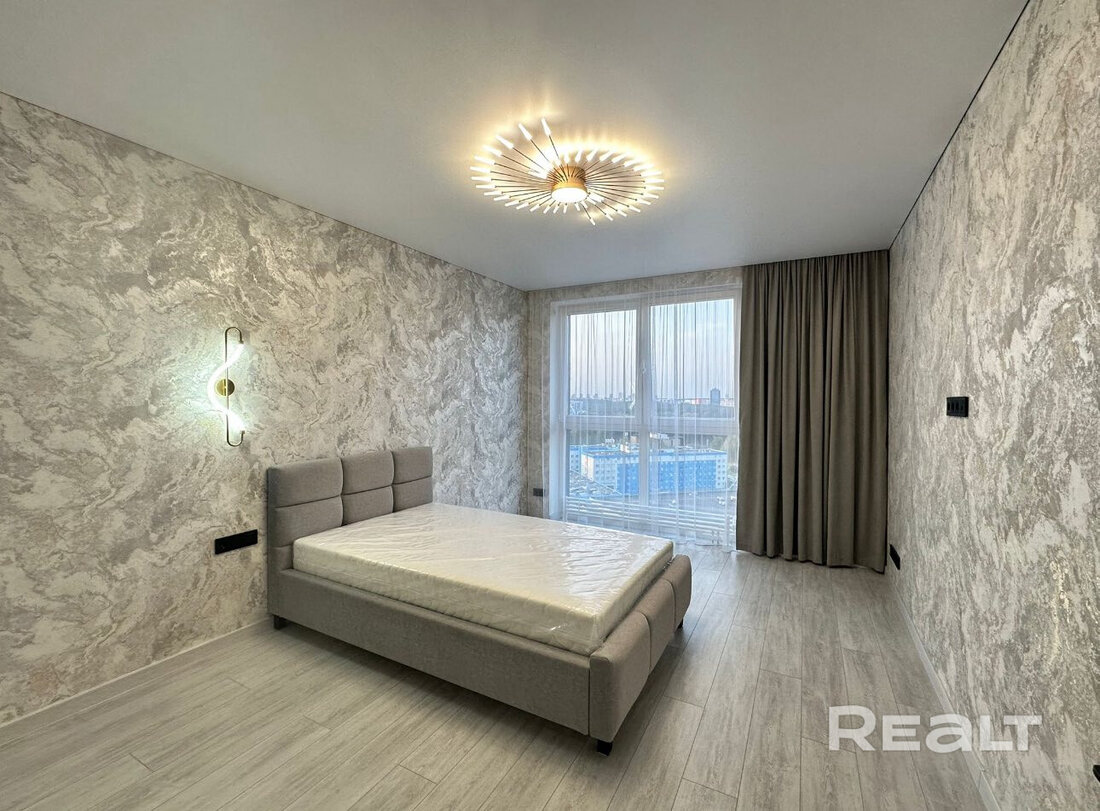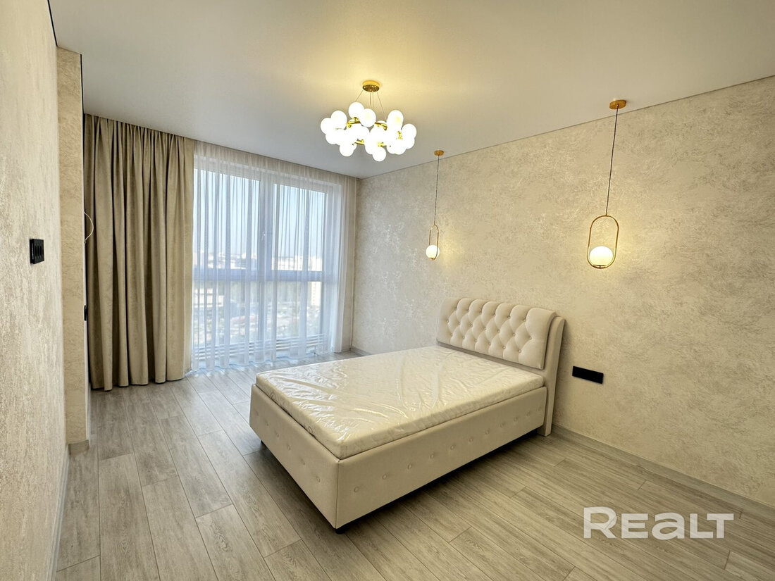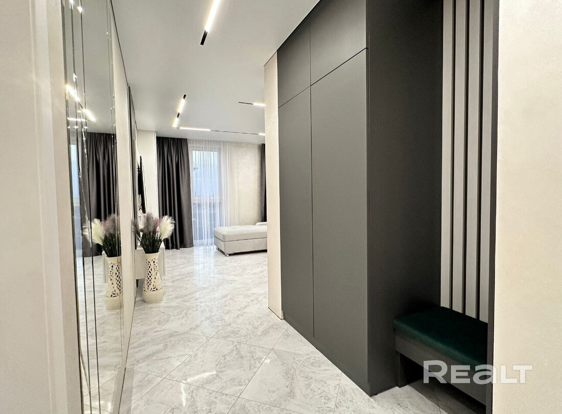 Евротрешка располагается на 15-м этаже. Общая площадь квартиры на Подлесной, 4 насчитывает 92 квадратных метра. На них собственник разместил кухню-гостиную, две спальни, гардеробную и санузел.