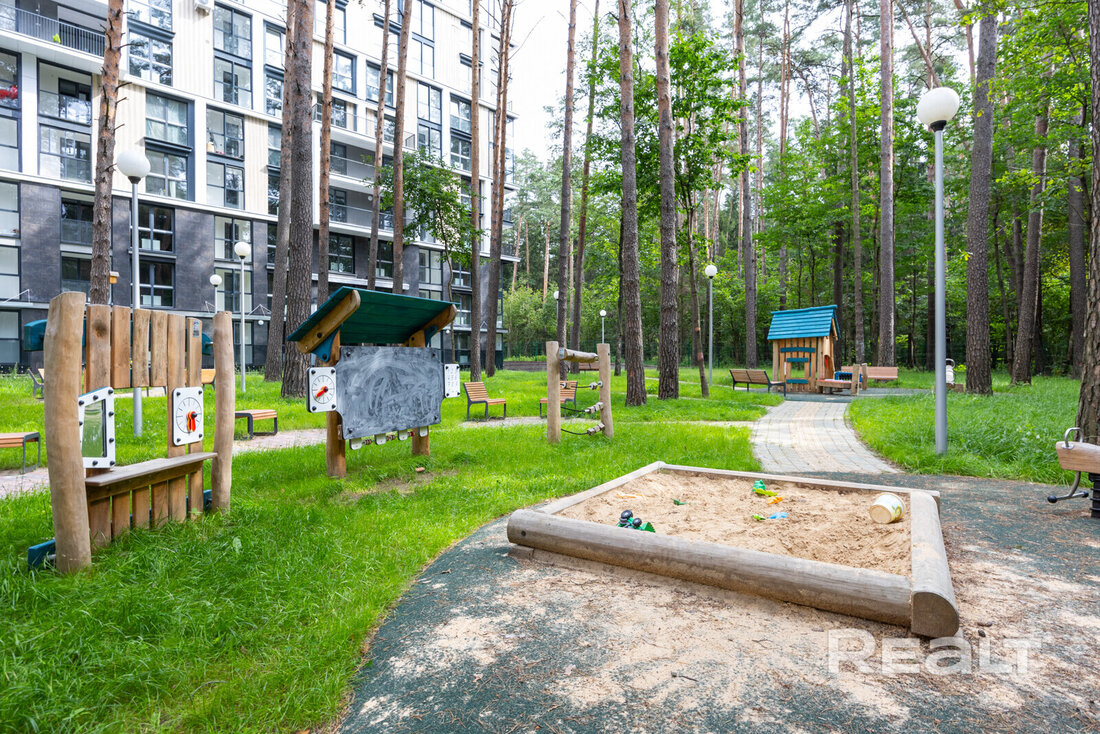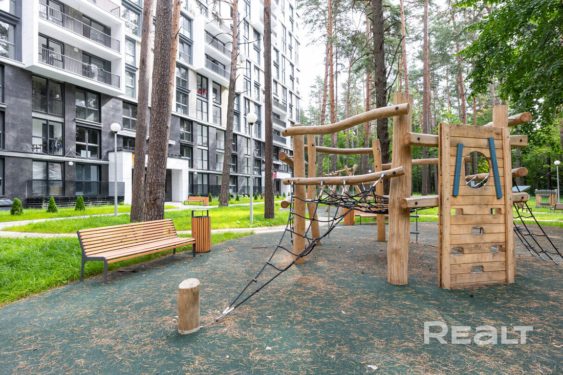 Конечно, одно из главных украшений комплекса — настоящий лес с взрослыми соснами прямо под окнами. Во дворе тут предусмотрены скамейки, детские площадки и велобоксы. Проникновению внутрь посторонних препятствует еврозабор.
