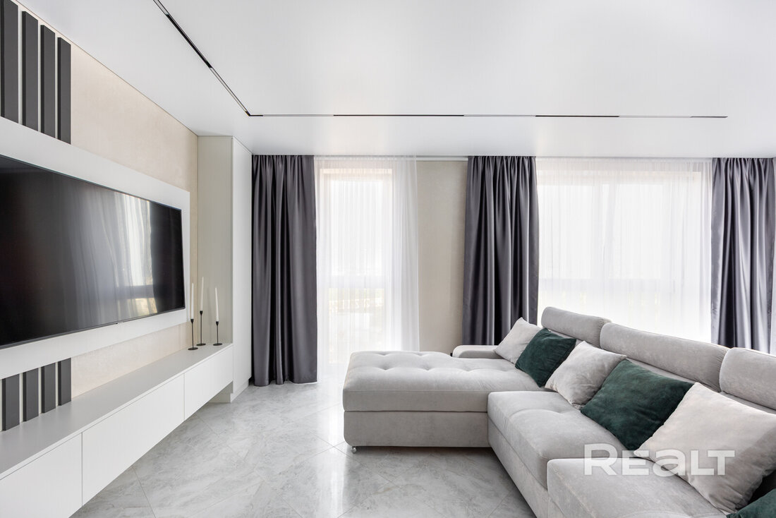 Все помещения уже обставлены мебелью. Тут есть кухня с техникой, диван, телевизор, кровати, светильники и шторы.