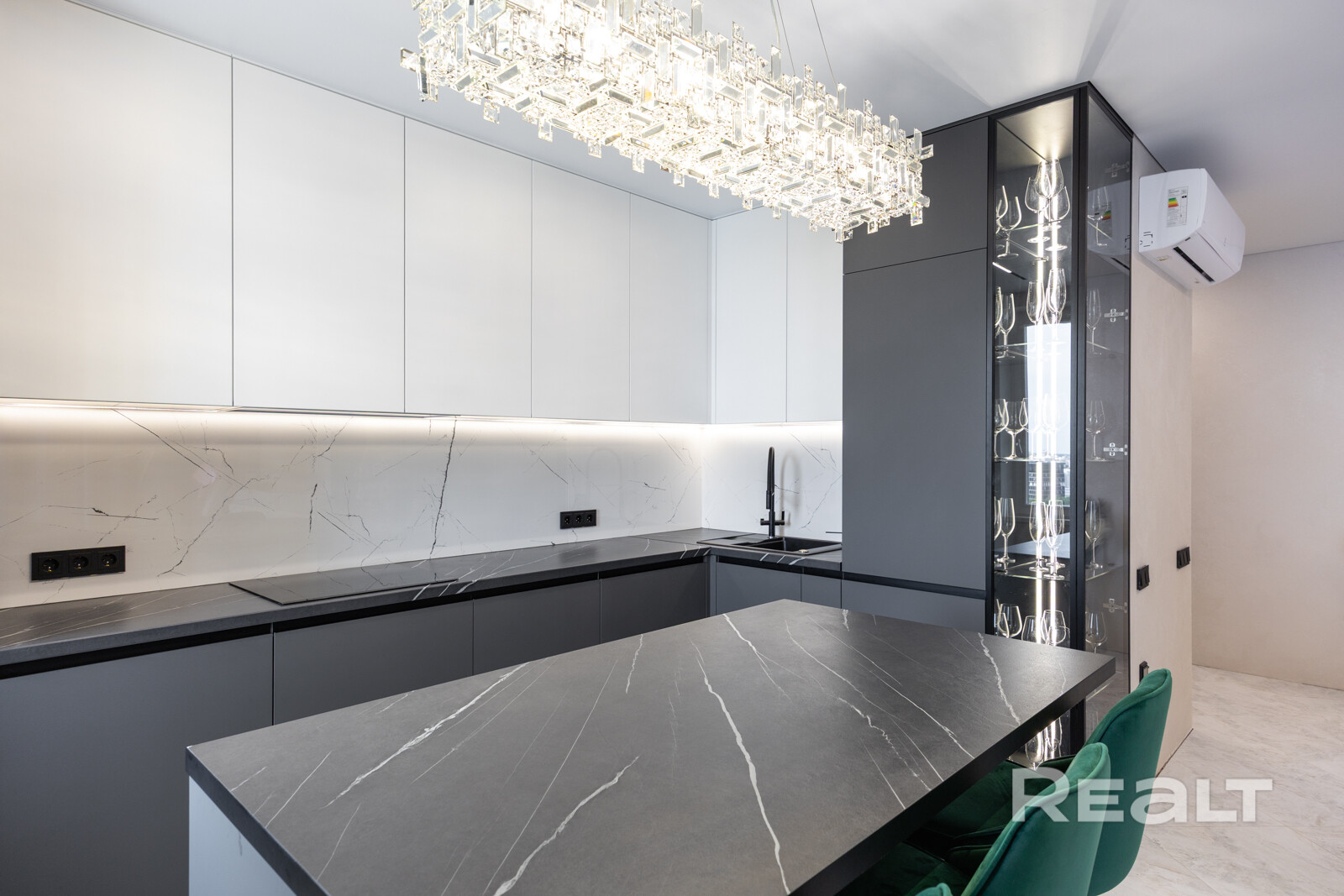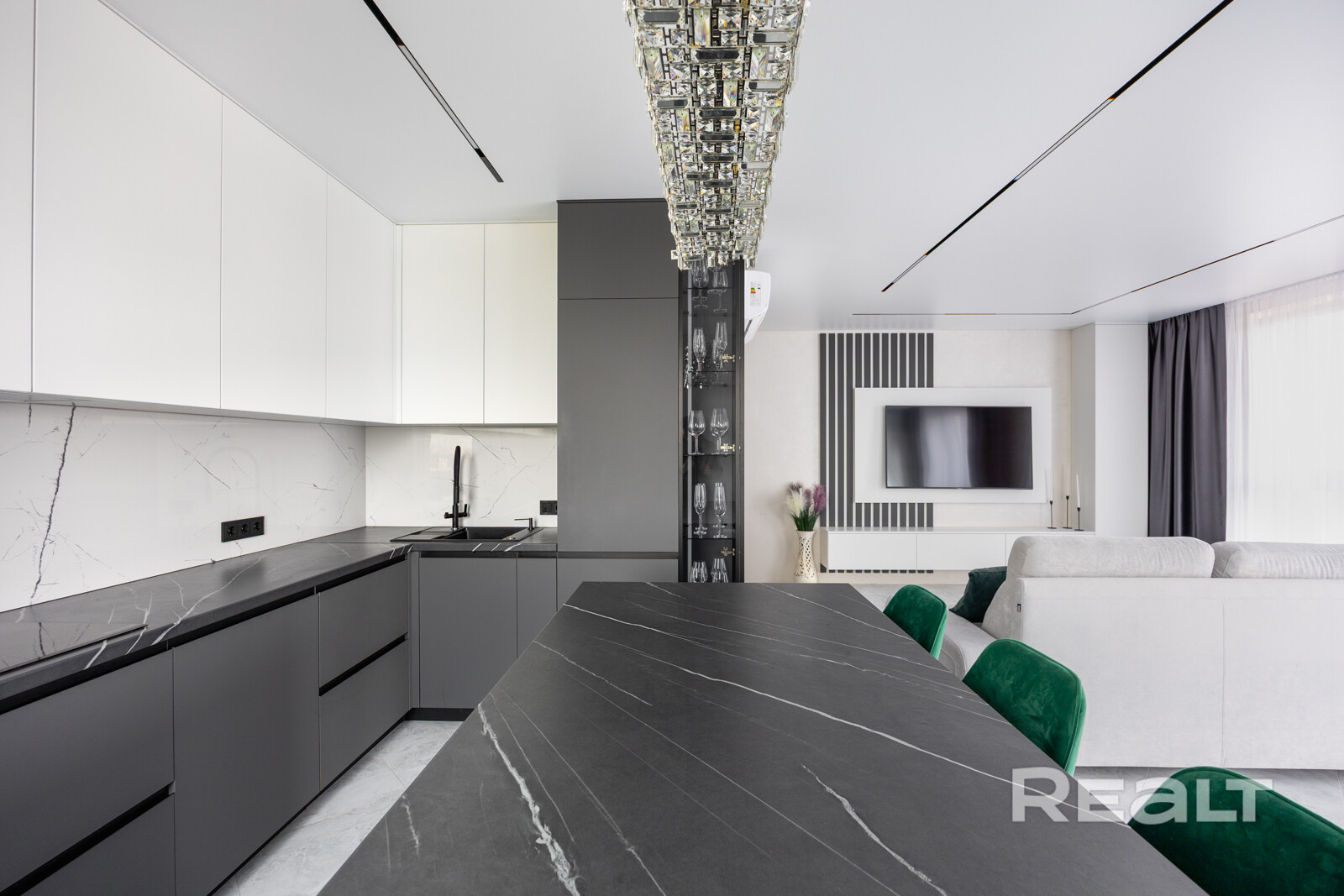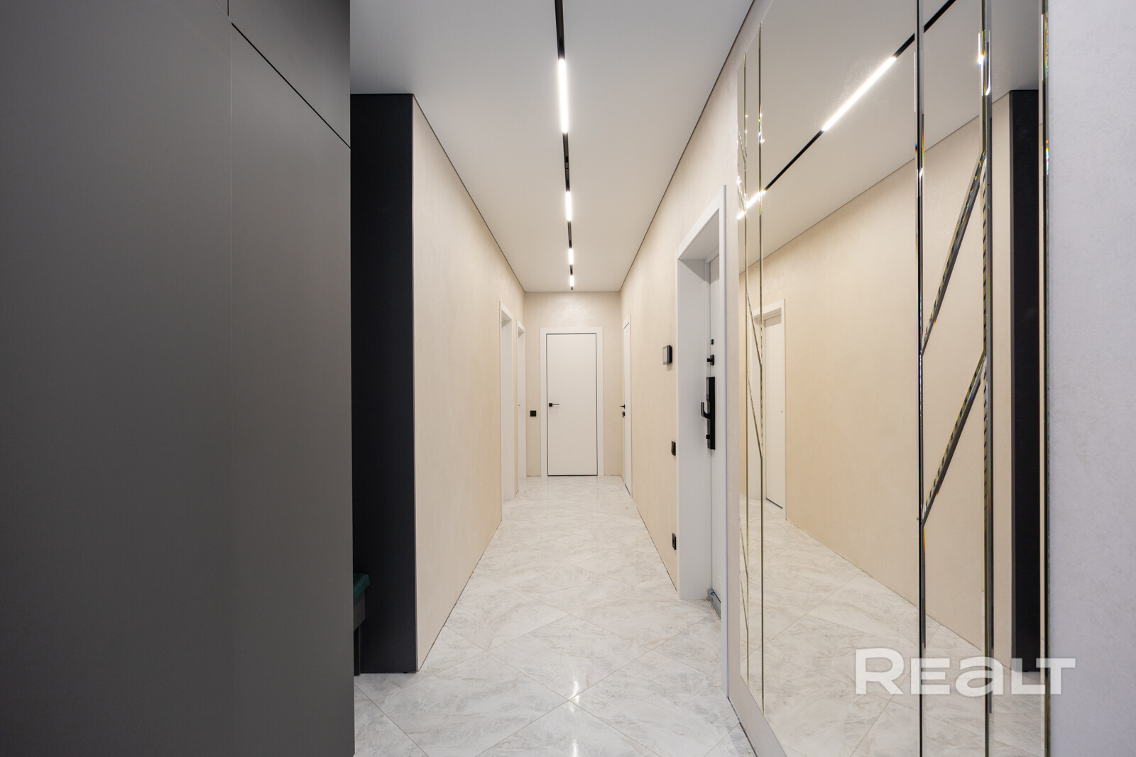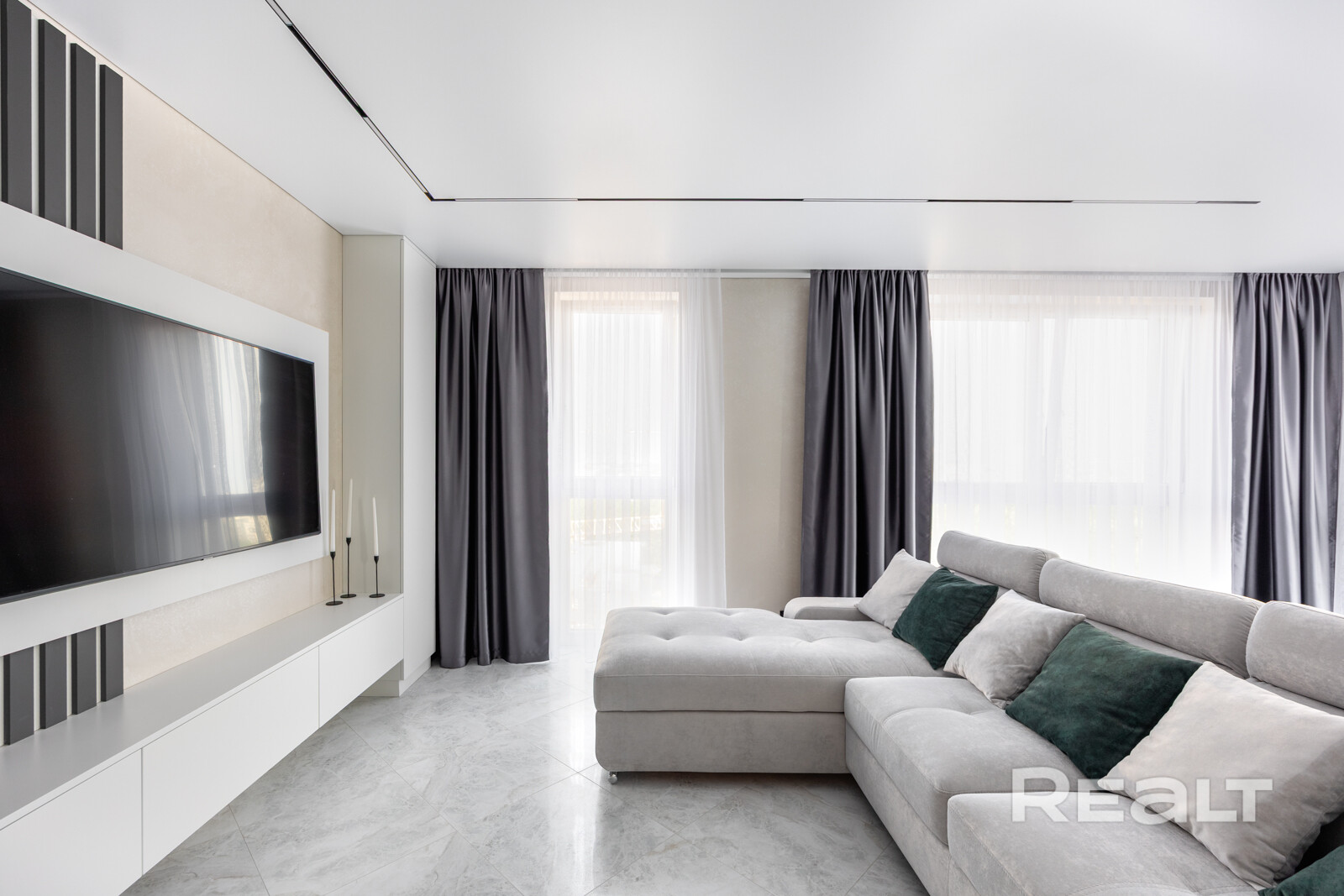 Евротрешка располагается на 15-м этаже. Общая площадь квартиры на Подлесной, 4 насчитывает 92 квадратных метра. На них собственник разместил кухню-гостиную, две спальни, гардеробную и санузел.