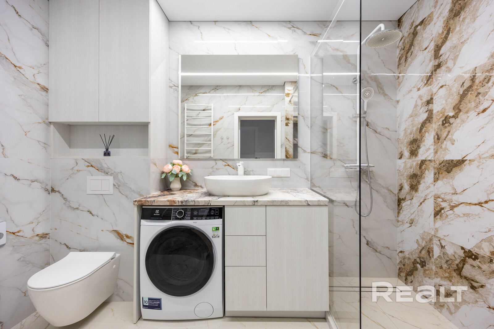 Санузел с душевой кабиной и стиральной машиной тоже полностью готов к использованию.
