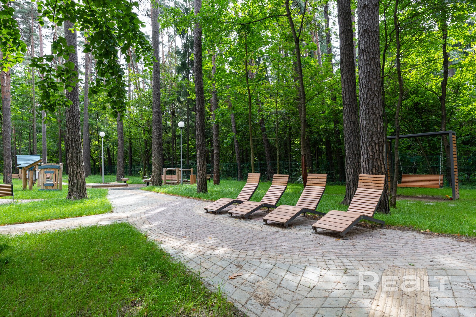 Конечно, одно из главных украшений комплекса — настоящий лес с взрослыми соснами прямо под окнами. Во дворе тут предусмотрены скамейки, детские площадки и велобоксы. Проникновению внутрь посторонних препятствует еврозабор.