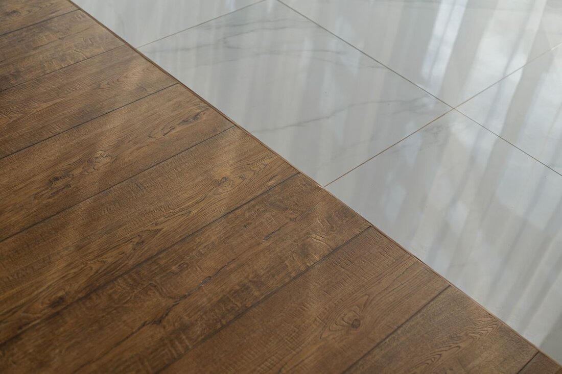 - Обратите внимание, как сделано примыкание ламината и плитки — с минимальным швом, в одной плоскости