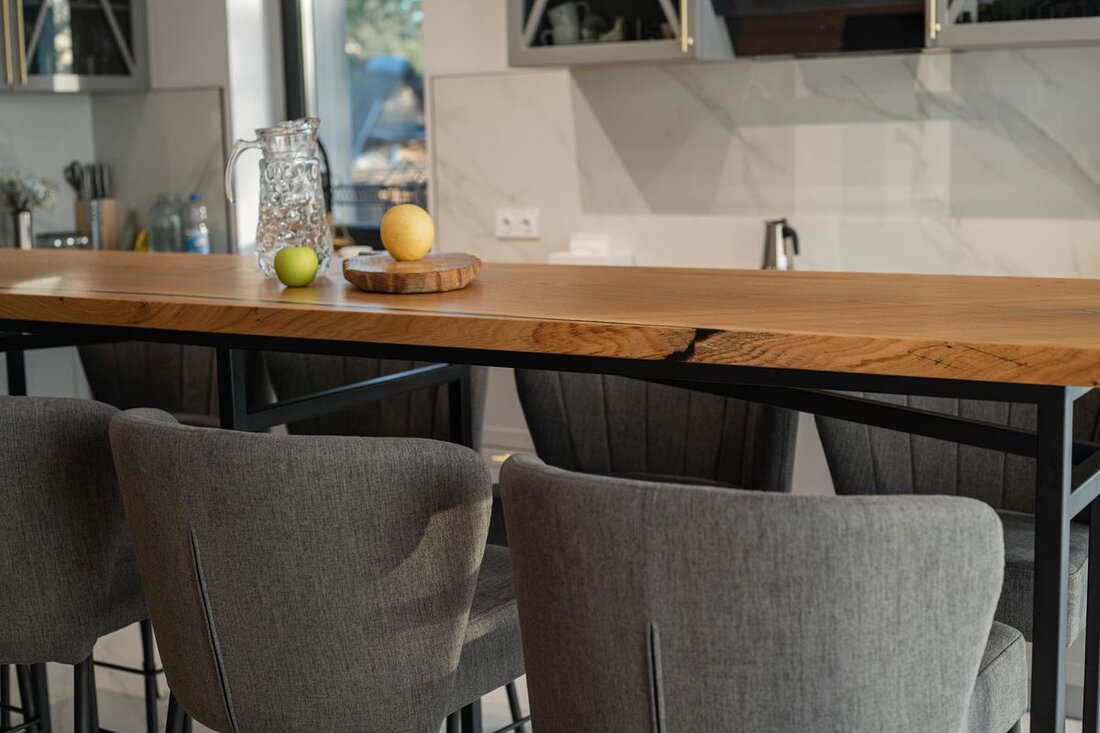 - Центр композиции в гостиной — большой барный стол. Он выполнен под заказ из слэба дуба с металлическими подстольем