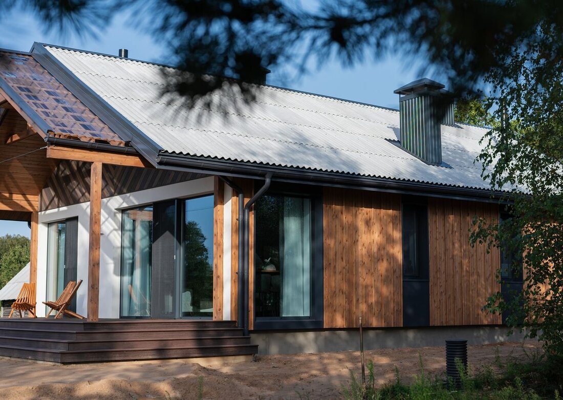 Здесь сложно не согласиться — с первого взгляда и издалека вам точно может показаться, что дом вполне привычный и из деревенской застройки не сильно выделяется — на крыше шифер, фасад обшит доской. Но это лишь первое впечатление и визуальный фокус — в какой деревне вы видели хаты с панорамными окнами и лиственничным планкеном?